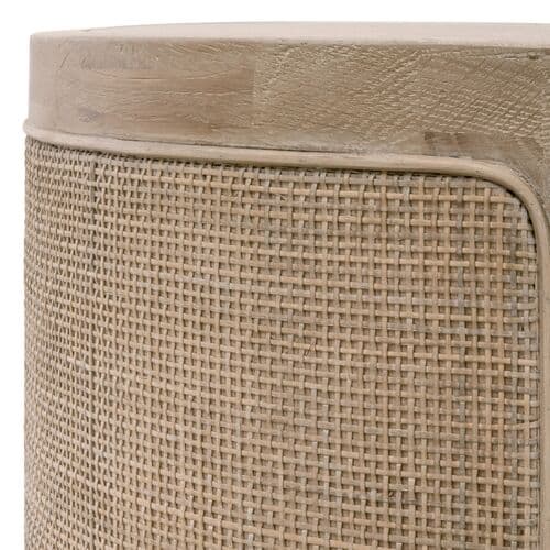 Distinctively grained oak with woven cane inlays makes this round end table both breezy and refined. Its design offers a textural contrast that adds a hint of tropical style to any space.