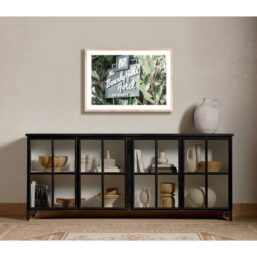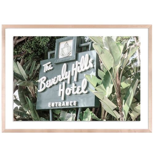 A framed paper print featuring Beverly Hills Hotel in California by Carly Tabak. Presented in a white frame, medium size.