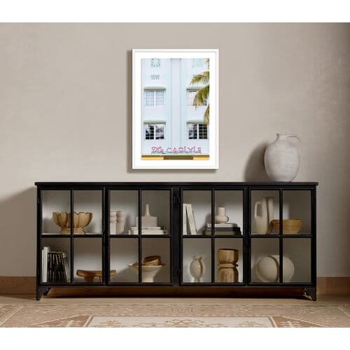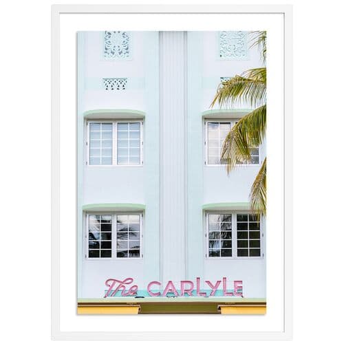 The artwork features The Carlyle in Miami, Florida, created by Carly Tabak, presented on framed paper in white. It is a medium-sized piece, making a splendid statement in any setting.