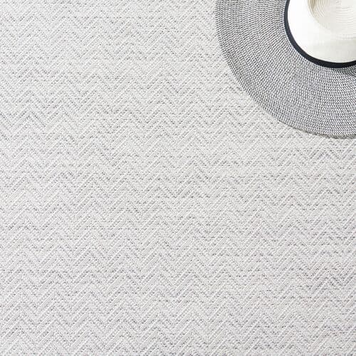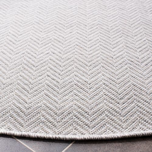 The chevron-patterned rug features tonal variations for depth and artisanal charm, suitable for outdoor or indoor spaces. It's designed to resist weather elements and is easy to clean—even with a hose. The latex backing ensures durability, and it's Oeko-Tex Standard 100 certified, confirming it is tested for harmful substances.