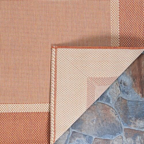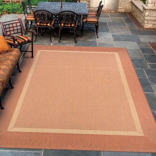 A flat-weave rug adds a tailored look to patios, porches, or entries. The rug is designed to resist fading, water, and mildew, maintaining durability under heavy traffic. For safety, consider using a rug pad to prevent slipping.