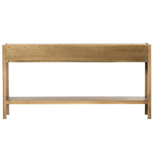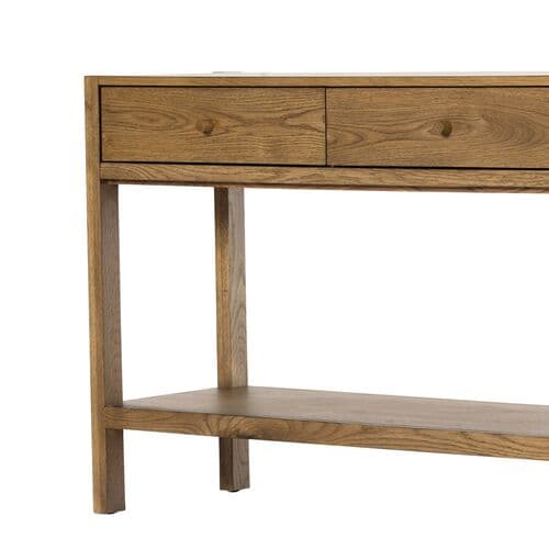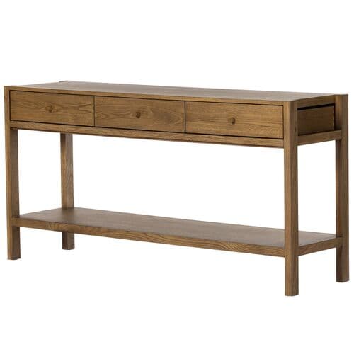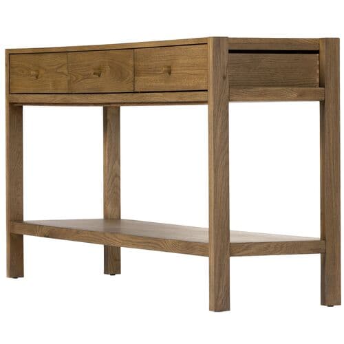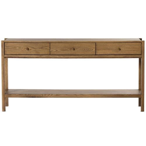 Showcasing artisanal simplicity, this three-drawer console table emphasizes the unique grain patterns of its robust oak construction.