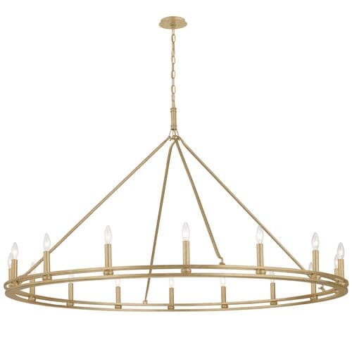 Two rings create the circular design of this chandelier. Candlesticks placed around the edge offer numerous bright lights. Available in either Champagne Silver Leaf or Textured Black, it is meant for indoor use exclusively.