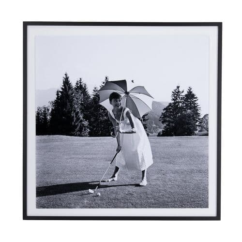 Audrey Hepburn, born in Belgium, enjoys a round of golf, captured in a photo from Getty Images' Hulton Archive, known for its vast private photographic collection. The photo is float-mounted and framed within black-finished American maple, providing a museum-like appearance. Each print is handmade in Austin, Texas, and includes a certificate of authenticity celebrating the partnership between Getty Images and Four Hands Art Studio.