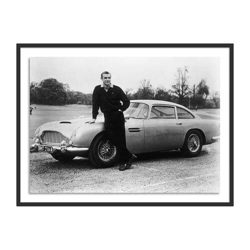 Sean Connery, as James Bond, poses next to an Aston Martin DB5 during the 'Goldfinger' shoot in Switzerland, 1964. Captured by Michael Ochs Archives for Getty Images, the image is printed on premium photo paper and float-mounted in a high-quality frame. Handmade in Austin, Texas, each piece comes with a certificate of authenticity, marking the exclusive partnership between Getty Images and Four Hands Art Studio.