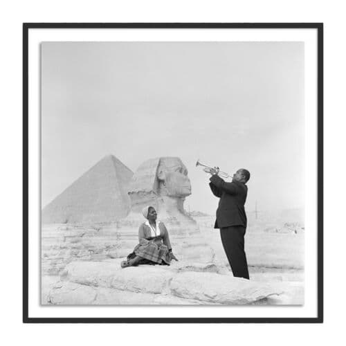 Louis Armstrong, an American jazz legend, is shown playing for his wife near the pyramids of Giza. The image is provided by Getty Images. It is printed on high-grade photo paper and float-mounted within a frame. Made by hand in Austin, Texas, each print comes with a certificate of authenticity to celebrate the exclusive partnership between Getty Images and Four Hands Art Studio.