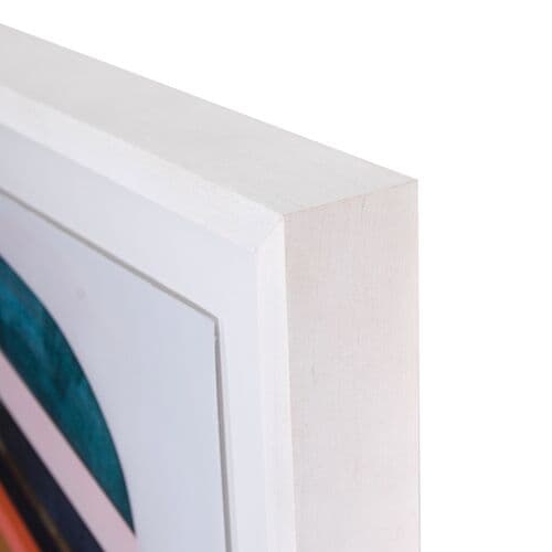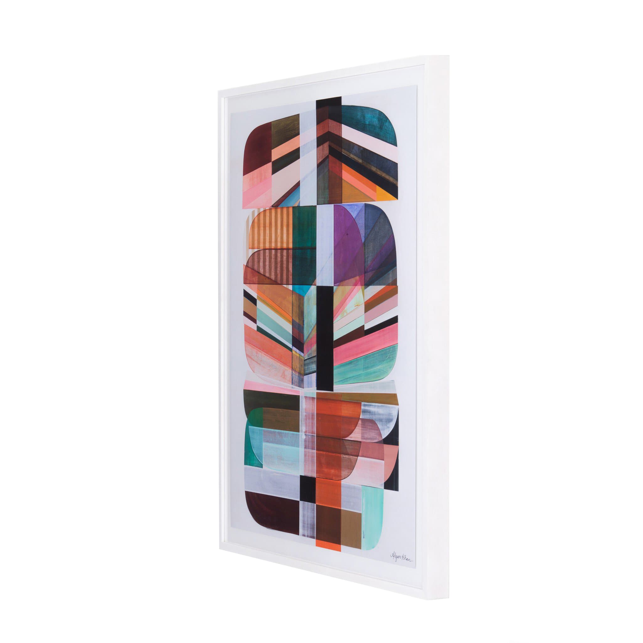 A vibrant and complex artwork by Denver artist Alyson Khan, printed on watercolor paper and set in a white-washed maple frame, offers a gallery-quality appearance. Each piece is handmade in Austin, Texas.