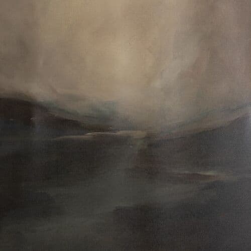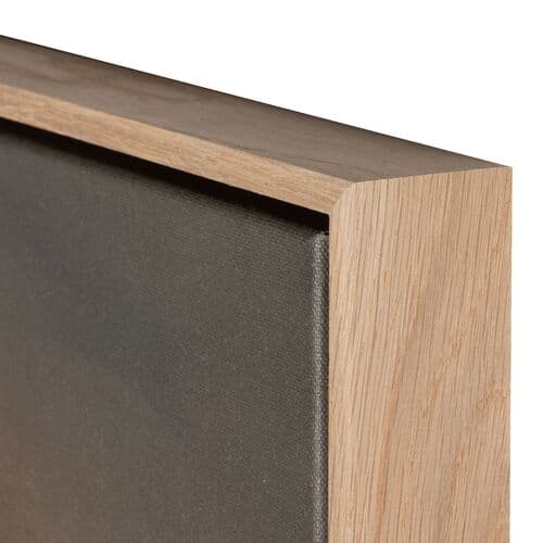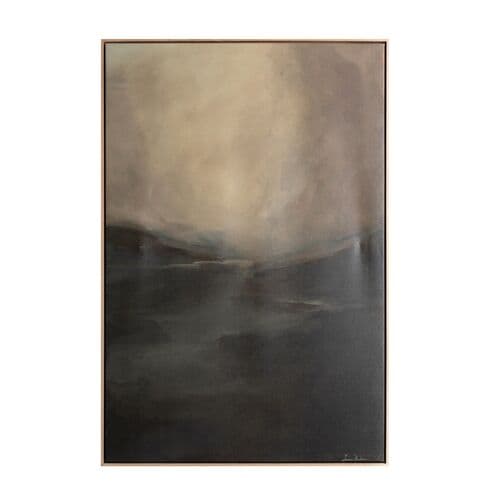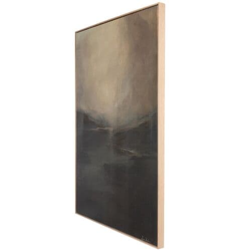 This artwork, inspired by nature and ordinary life's beauty, depicts fog rolling over hills on matte canvas. It's framed with a vertical grain white oak floater and crafted in Austin, Texas.