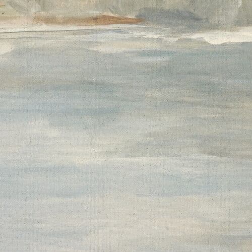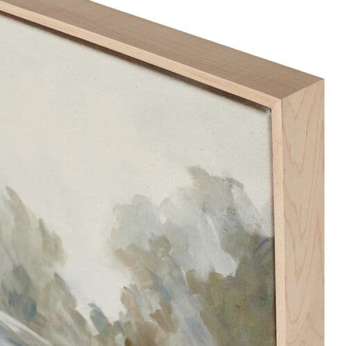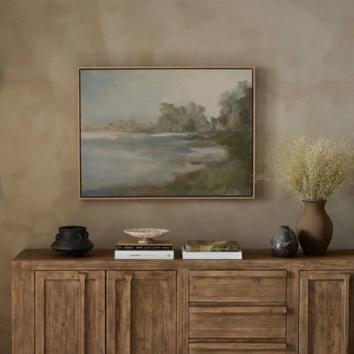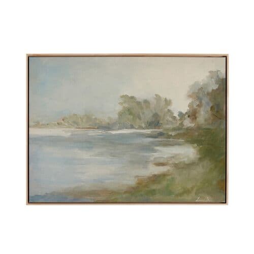 Drawing inspiration from nature, this artwork portrays a serene lake scene. It's complemented by a natural frame and made by hand in Austin, Texas.