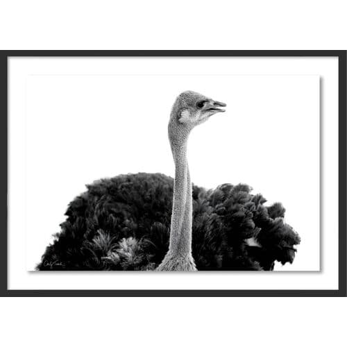 Experience a rare close encounter with an ostrich through Carly Tabak's black-and-white photograph. This framed piece is ready to hang. Through a lifelong love for photography, Carly Tabak has earned acclaim as a landscape photographer. Based in the San Francisco Bay Area, Carly creates impactful photographs inspired by her unique experiences and explorations.