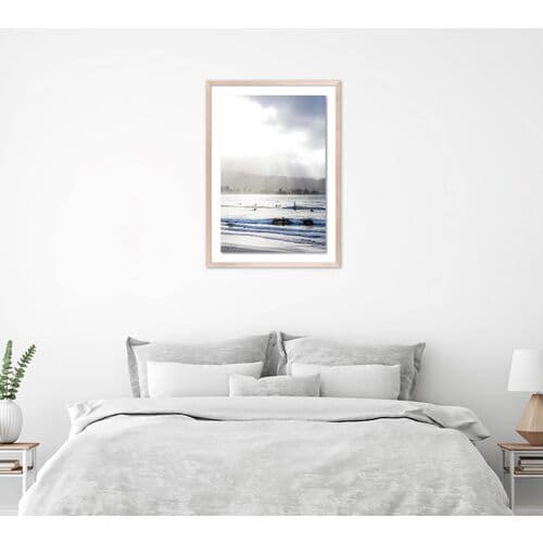 This photograph captures the joy of surfing during the day's last light, presented framed and ready to display. Carly Tabak, a San Francisco Bay Area-based landscape photographer, has turned her lifelong passion into acclaimed art. Known for her exploration, Carly's photography encapsulates the elements and energy of her unique experiences.
