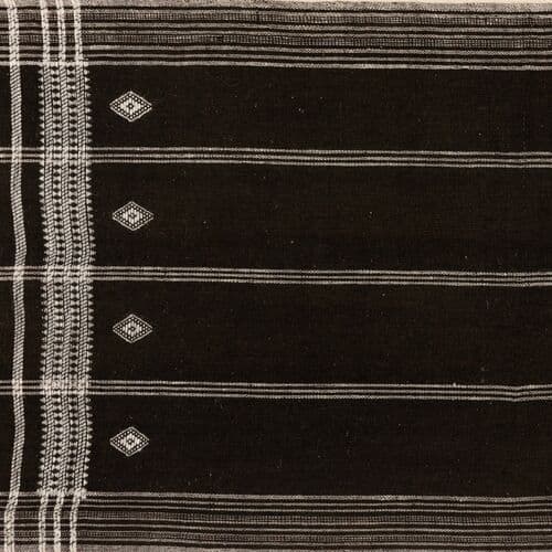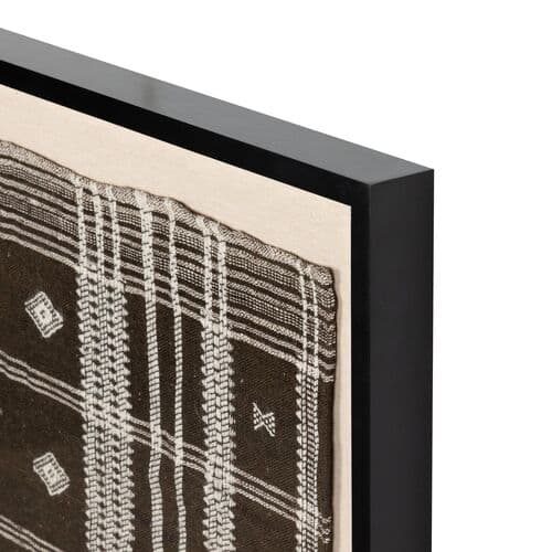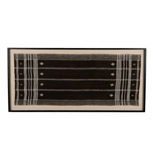 A Bhujodi-style textile is artistically framed within high-quality wood to create a gallery-quality appearance. Expertly handmade in Austin, Texas.