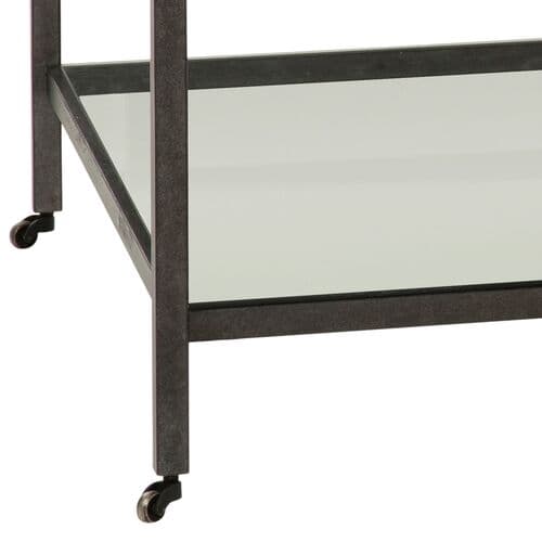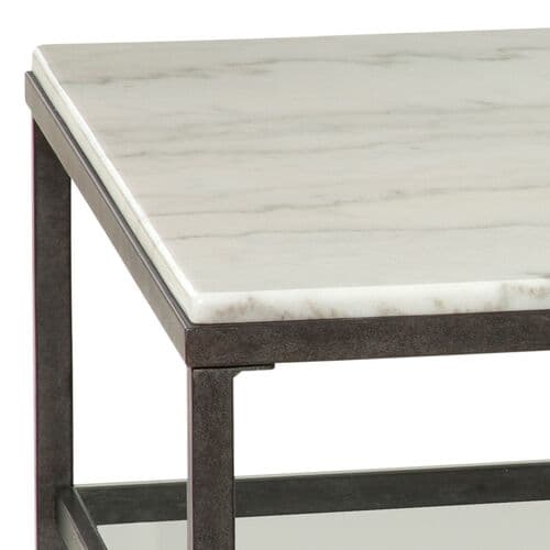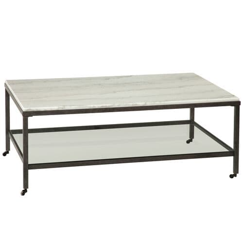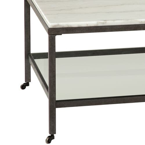 Linden's cocktail table showcases a striking bronze and ivory marble contrast. The solid stone top is supported by a steel base, equipped with piano casters for added versatility. The design includes a clear glass shelf for additional storage.