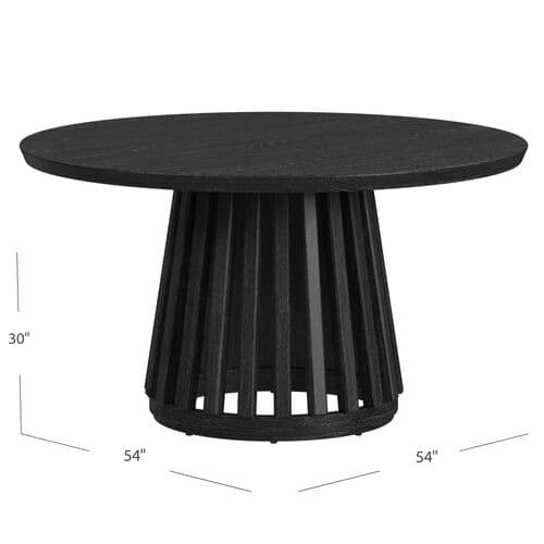 The Everett Round Dining Table showcases a round tapered slat base for a modern aesthetic. It includes adjustable floor levelers for stability. The table comfortably accommodates up to four people.