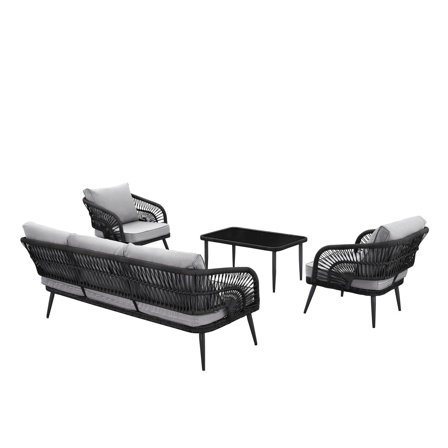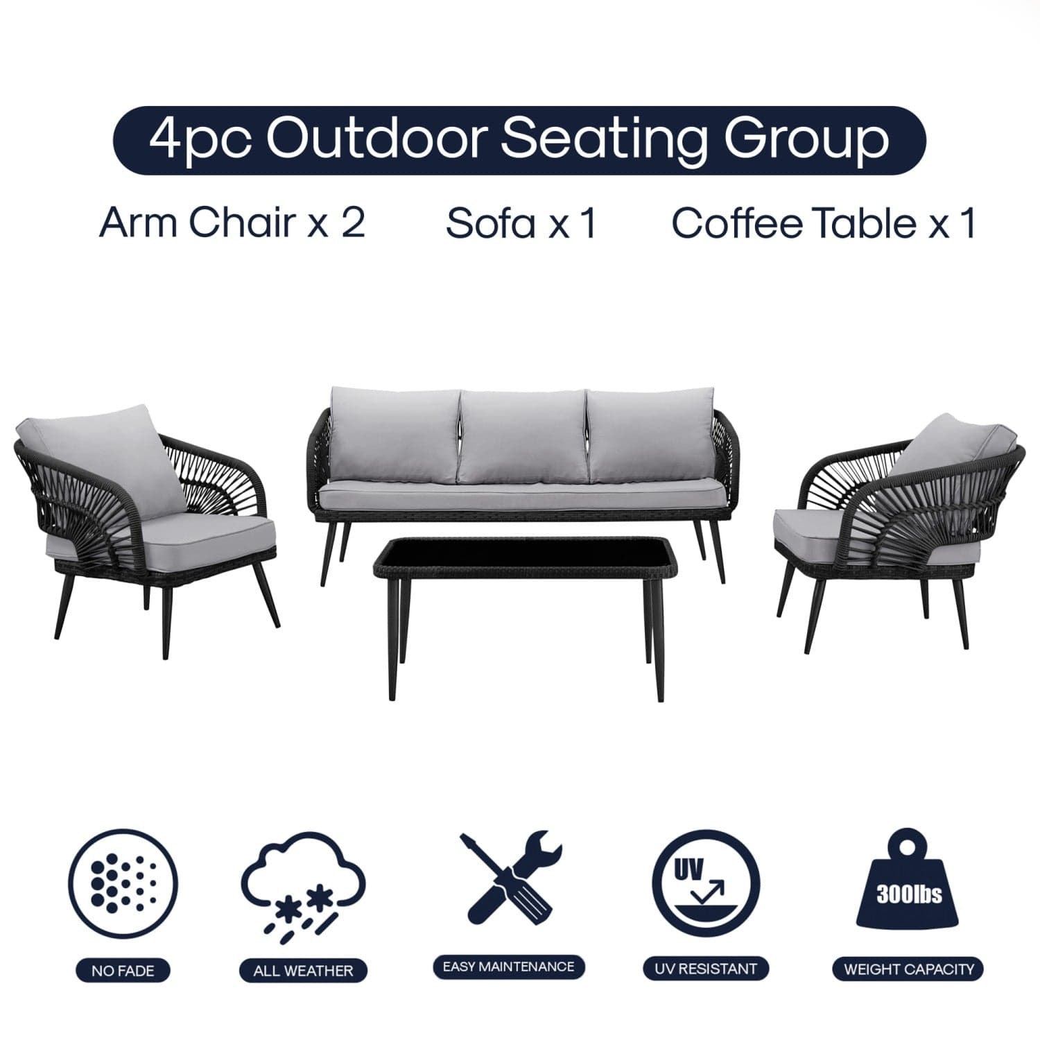 Relish in life's pleasures with this 4-piece bohemian rattan wicker seating group, perfect for gatherings. It includes a sofa, two armchairs, and a coffee table for a family-style setting. Crafted with all-weather faux rattan wicker, suitable for indoor and outdoor use, this set brings a stylish boho look to any space. The UV-resistant materials ensure durability, while the removable cushions offer easy care. Features a boho style for a breezy feel, complementing any setting with durable construction. Ideal for patio or backyard, this set includes versatile pieces for any occasion. The modern and versatile seating group provides both comfort and style. Dimensions of each piece: Sofa: 69.5"L x 30"W x 27"H, Chair: 27"L x 30"W x 27"H, Coffee Table: 35.5"L x 21.5"W x 15.8"H.