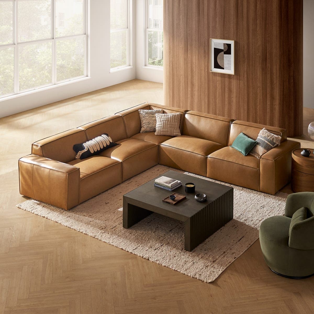 Swathed in luxurious leather, Jonathan's modern sensibility shines through while keeping to its clean silhouette and lounge-worthy modular seating.