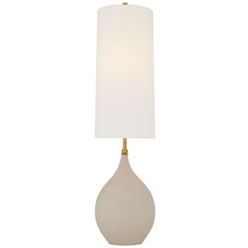 Designed by Thomas O'Brien, the table lamp features a teardrop-shaped ceramic body with an off-white finish that complements various color schemes. The elongated linen shade and golden trim highlight its refined design.