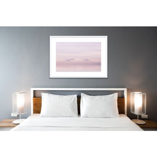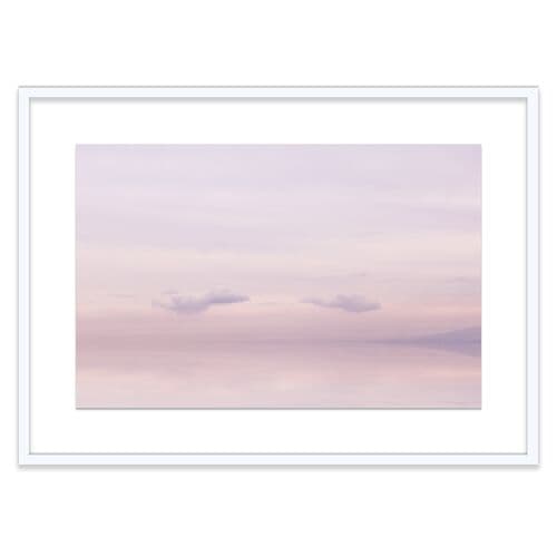 Claudia Lucia's photograph captures two cumulus clouds set against vast purple-and-pink skies. Printed on high-quality photo paper and framed in pine, it arrives ready to hang. Drawing inspiration from Southern California, Lucia's work features bright, airy compositions with intentional color schemes. Though typically focused on editorial photography, her images explore spaces through the lens, a passion rooted in her childhood and continuing to inspire her.
