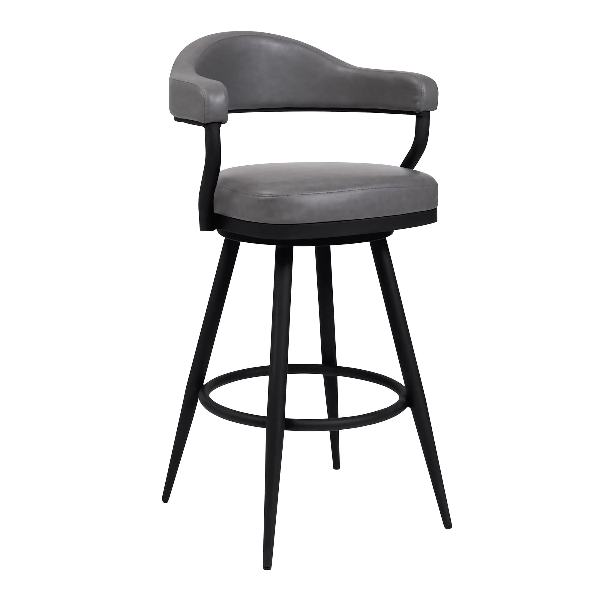Armen Living presents the Justin counter stool, perfect for modern interiors. It features a sturdy black powder-coated metal frame and vintage gray faux leather upholstery. The design offers contemporary style and durability, with a low back for lumbar support. Thanks to its 360-degree swivel seat, mobility is effortless. The stool also includes a ringed footrest and floor protectors to prevent floor damage.
