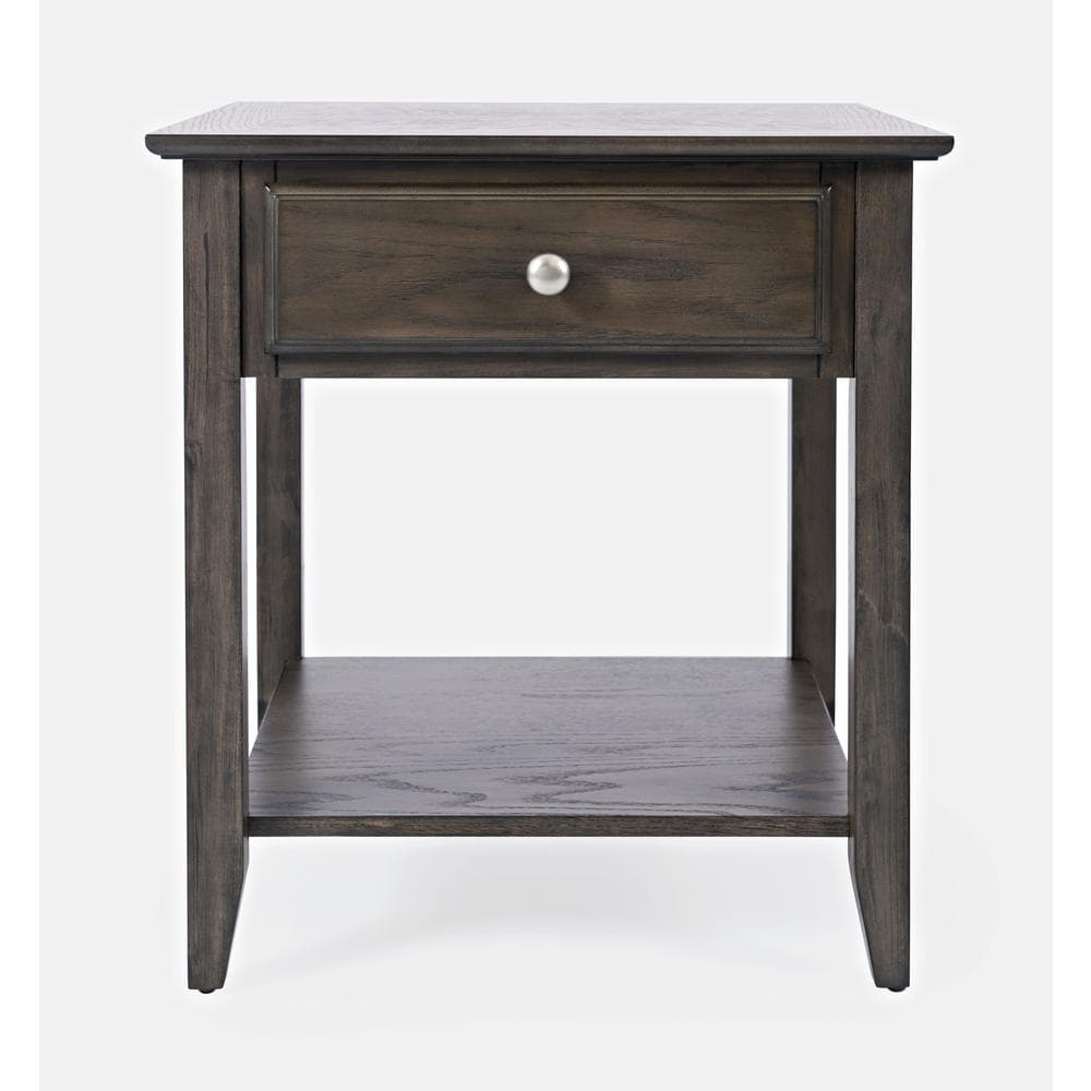 A splendid finish, dovetailed drawer, and brushed nickel hardware define this espresso modern end table. Offers ample storage with a full-size drawer and shelf, complementing a living room sofa, a den chair, or serving as a stylish nightstand in a bedroom. Available in espresso brown and grey-brown Carlton finishes.