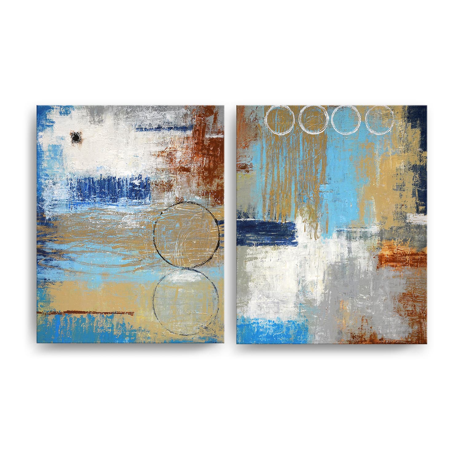Featuring patches of blue, beige, and white with circular rings, this horizontal 2-piece abstract art set adds a unique touch to your decor. Titled 'Niagra I/II,' it blends well with both transitional and contemporary styles. Handcrafted in Chattanooga, Tennessee by Ready2HangArt, the piece uses a locally sourced artist print on canvas. It is assembled on an eco-friendly pine wood frame and includes a rear hanger for easy installation. Norman Wyatt's collections, known for their diverse subjects and unique textures, enhance any modern or contemporary space. Theme: Abstract
