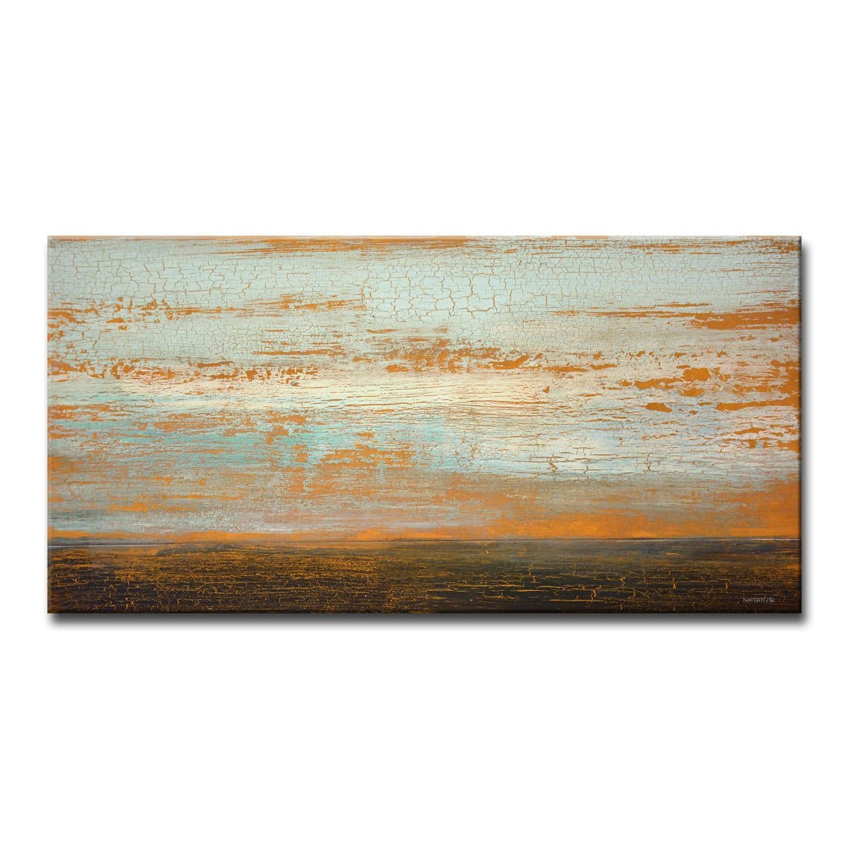 Teal, orange, and brown brushstrokes create a desolate horizon in this abstract canvas art. The 'Desert Flats' piece by Norman Wyatt complements modern spaces with a transitional aesthetic. Handcrafted in Chattanooga, Tennessee by Ready2HangArt, it features a locally sourced artist print on canvas, assembled on an eco-friendly pine frame with a rear hanger for easy installation. Norman Wyatt's collection offers diverse subjects and unique textures to enhance any decor. Theme: Abstract