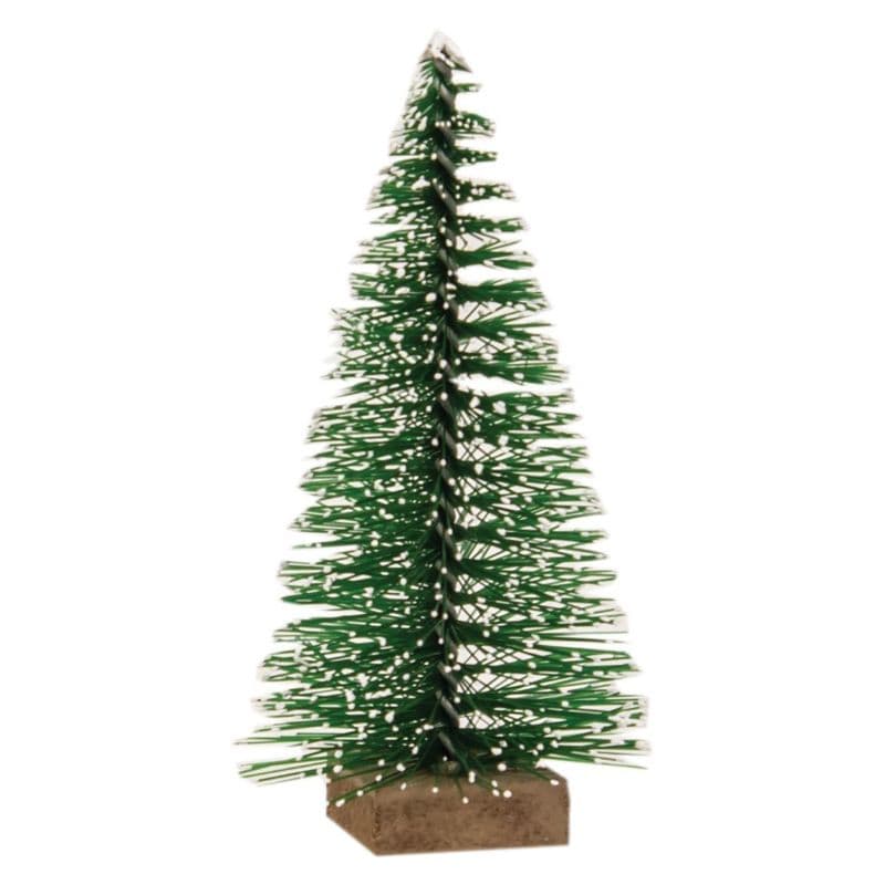 Enhance your home with the Frosty Bottle Brush Tree's simple appeal. It features deep green pine needles with a frosted finish on a wooden base. This freestanding tree complements tabletops adorned with similarly styled brush trees, seasonal flowers, or holiday box signs. Standing at 4 inches tall, it's an ideal decoration throughout the season.