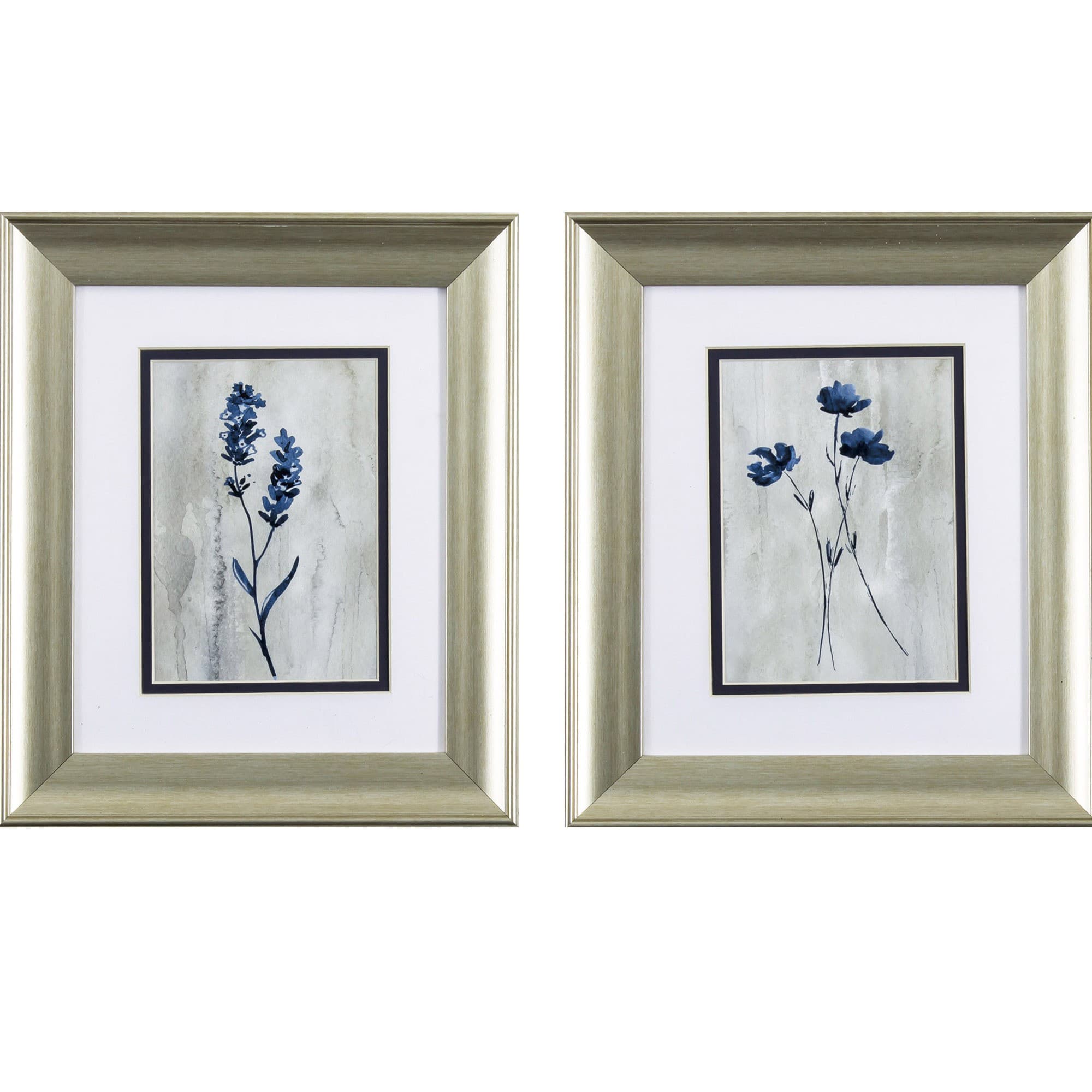 Blue and gray flower-themed wall art introduces a simple, elegant outdoor vibe to your space. These pieces are double matted and encased in silver frames, making them a delightful addition to nearly any room. Each 13" x 11" x 1" piece can be hung together or separately, depending on your design preference. This set of two offers flexibility in decor arrangement.