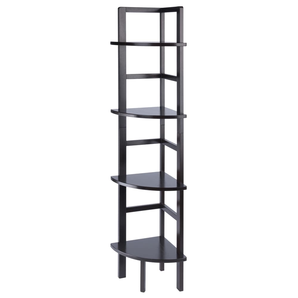 The Winsome Aiden Corner Baker's Rack blends modern style with classic Tuscan design and optimizes unused corner space. Four open shelves with 15'' clearance each can display decorative items, plants, or photos. Crafted from solid wood with a rich Coffee finish, it enhances the kitchen, living room, dining area, or bathroom.