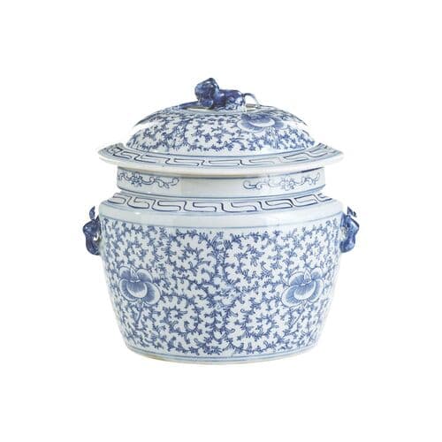 Crafted from porcelain, this lidded rice jar features elegant blue flourishes and a lion-shaped finial.