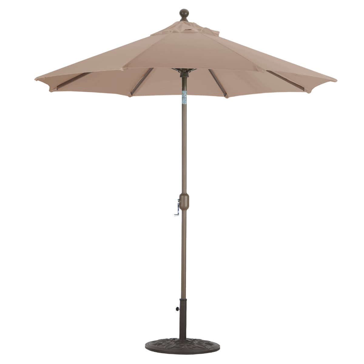 Sunbrella fabric is a robust acrylic material with UV-stabilized pigments to maintain color and resist fading. It offers up to 98% protection from UV rays, ensuring long-lasting color. Sunbrella materials are also designed for stain and water resistance, safeguarding against mold and mildew. They allow air to circulate, and cleaning is simple with mild soap and warm water. Shade Size: 7.5'. Type: Market Umbrellas. Tilt Method: Auto. Lift Method: Crank.