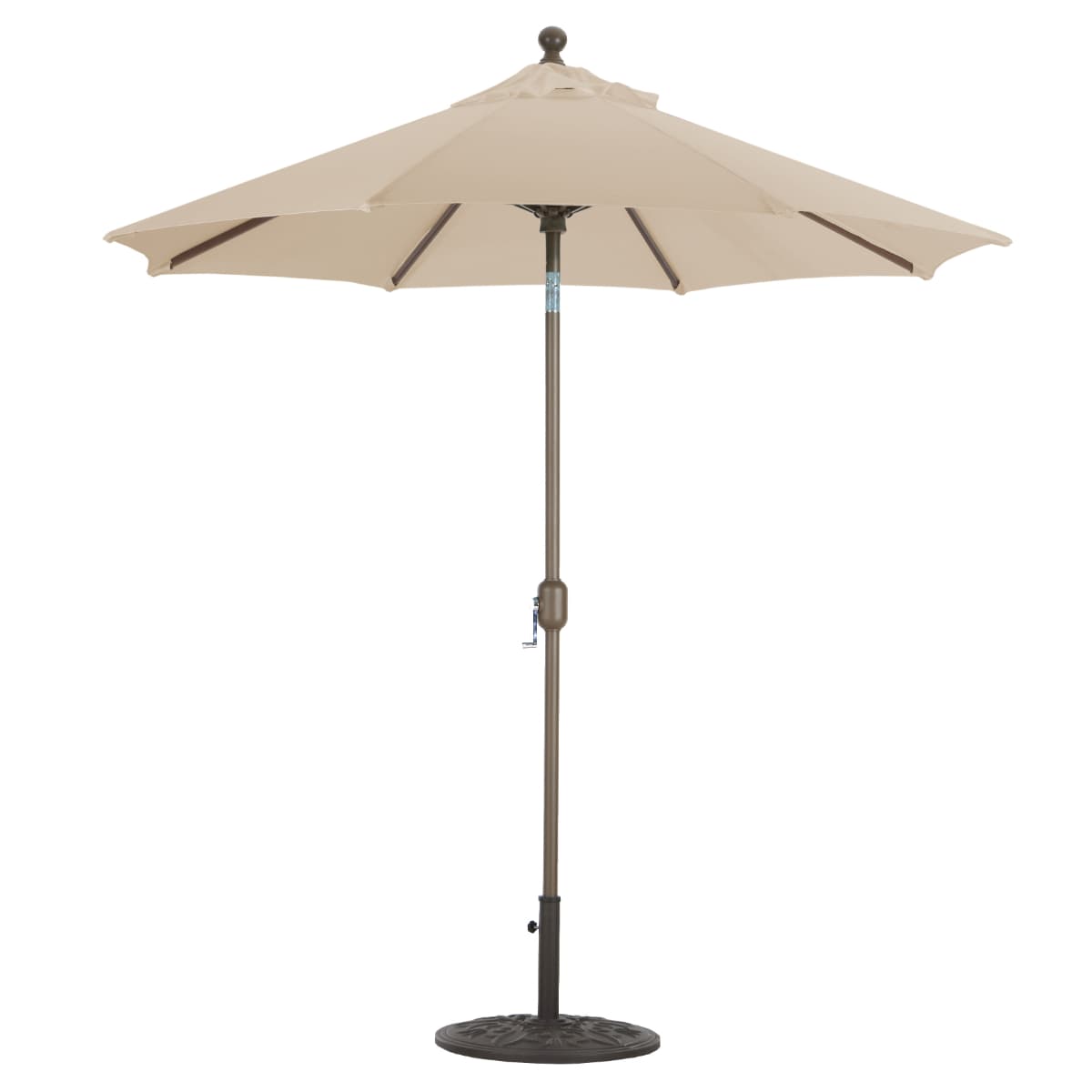 Fabric of the umbrella is made from solution dyed acrylic. The fibers are saturated with UV stabilized pigments to hold color and prevent fading. It has been tested and graded as providing up to 98% UV-protection. The umbrella fabric has a built-in stain and water-resistance which also protects against mold and mildew. Air can pass through the fabric and maintenance can be handled with mild soap and warm water for most messes. Shade size is 7.5'. Tilt method is auto and lift method is crank.