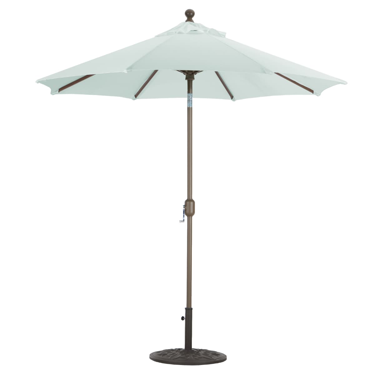 Sunbrella fabric is durable, with fibers infused with UV pigments to maintain color and resist fading. It offers up to 98% UV protection and features built-in stain and water resistance to prevent mold. The breathable material allows air circulation, and mild soap with warm water handles most cleaning. Shade Size: 7.5'. Umbrella Type: Market Umbrellas. Tilt Method: Auto. Lift Method: Crank.