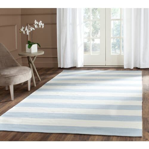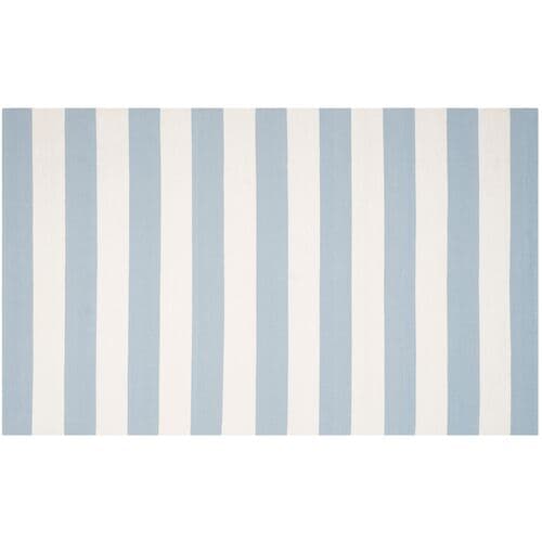 Featuring sky blue and white cabana stripes, this handwoven cotton rug adds texture and a casual pattern to any space. Using a rug pad is suggested to enhance its longevity and maintain stability.