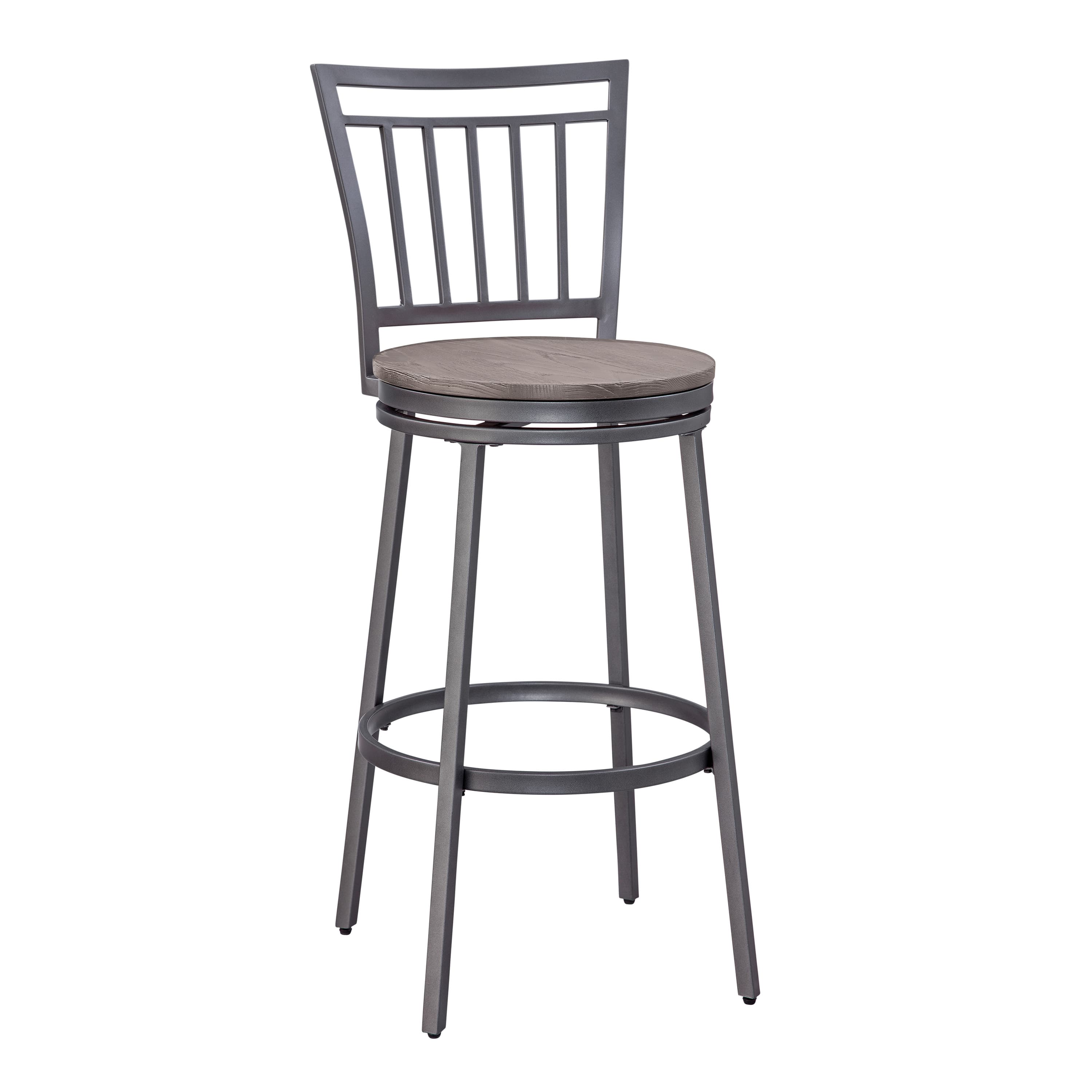 Talia Bar Stool presents modern style with clean lines and angles, fused with rustic charm. Its steel frame, finished in slate grey, supports a dark, driftwood grey hardwood seat. It includes a full back with a metal slat design for comfort and a functional swivel seat. Each purchase includes one bar-height stool. The seat height is 30 inches.