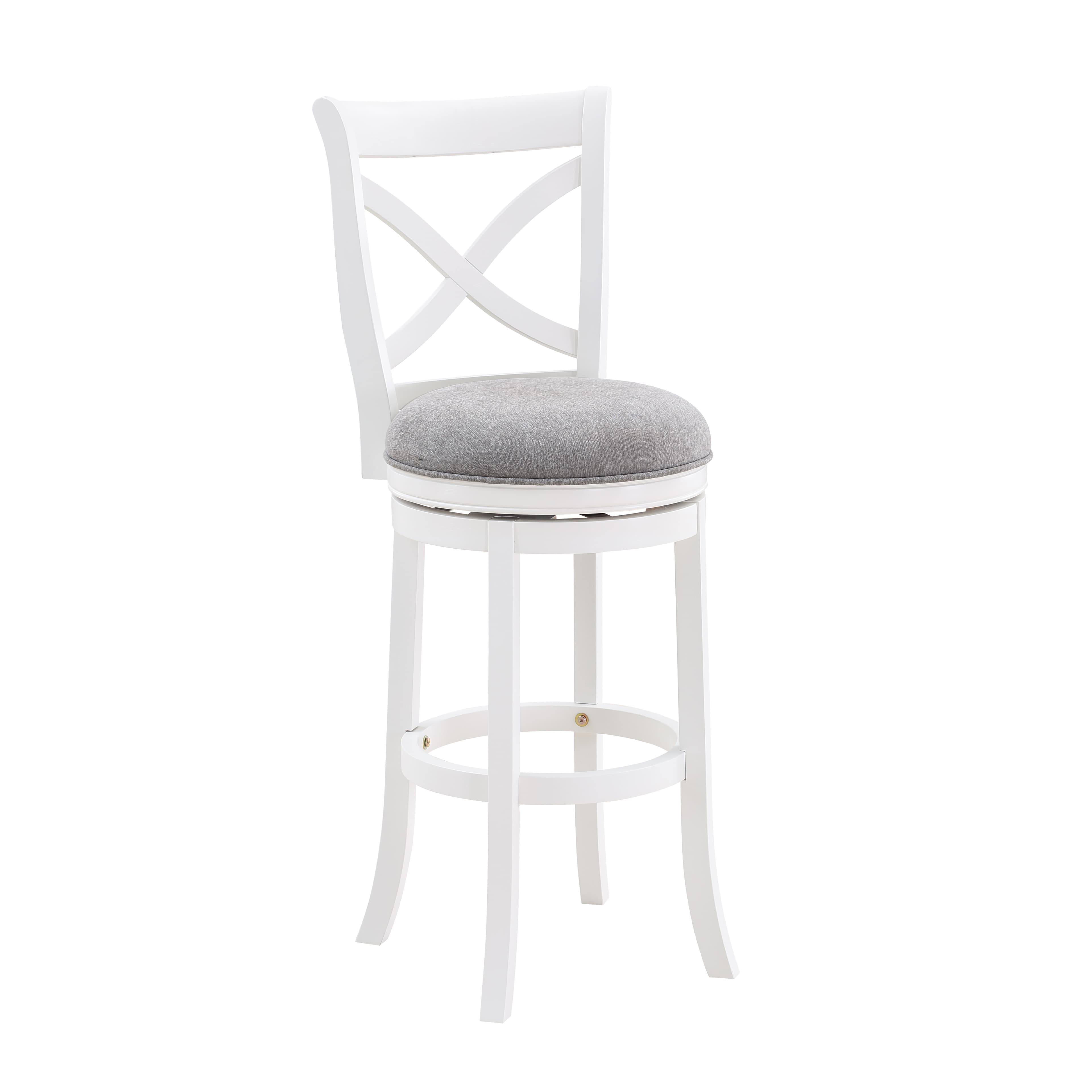 The Belmont Stool delivers a relaxed style that seamlessly fits into most decor. It has a solid hardwood frame paired with a light gray upholstered swivel seat and an elegant French Curve X back. Available in White or Black finishes and in Counter or Bar Height. The stool purchase includes one piece with a 30-inch seat height, featuring a swivel and cushioning. The stool showcases a full back design.