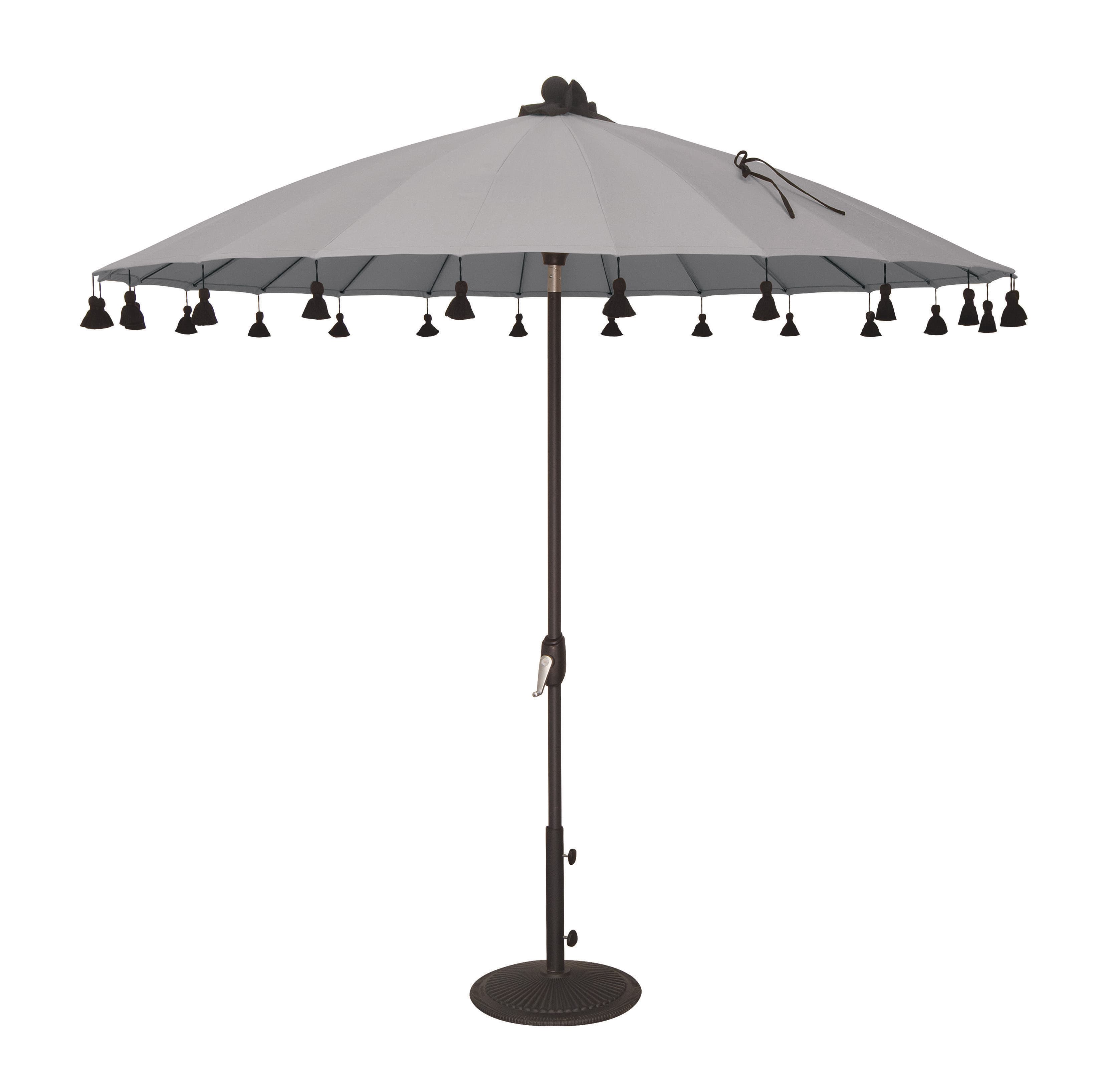 The Isabela Market Umbrella showcases a distinctive design with a fabric-covered finial, 24 steel ribs, and tassels in Sunbrella black. The Auto Tilt feature enables users to adjust the umbrella's angle for continuous enjoyment, even while relaxing with guests. After the canopy is open, use the handle to tilt the canopy to various angles for optimal shade and comfort. Umbrella Type: Market Umbrella. Shade Size: 8.5'. Tilt Method: Auto. Lift Method: Crank. Shade Shape: Round.