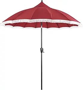 Enhance your outdoor space with this accessory, perfect for relaxing with friends. The 180g polyester canopy features a Fringe Design. Boasting a powder-coated aluminum frame, this umbrella offers ample shade during hot days. The tilt function provides an adjustable angle. Standard-sized pole fits most stands and bistro sets designed for umbrellas. Market type with a 9' shade and automatic tilt.