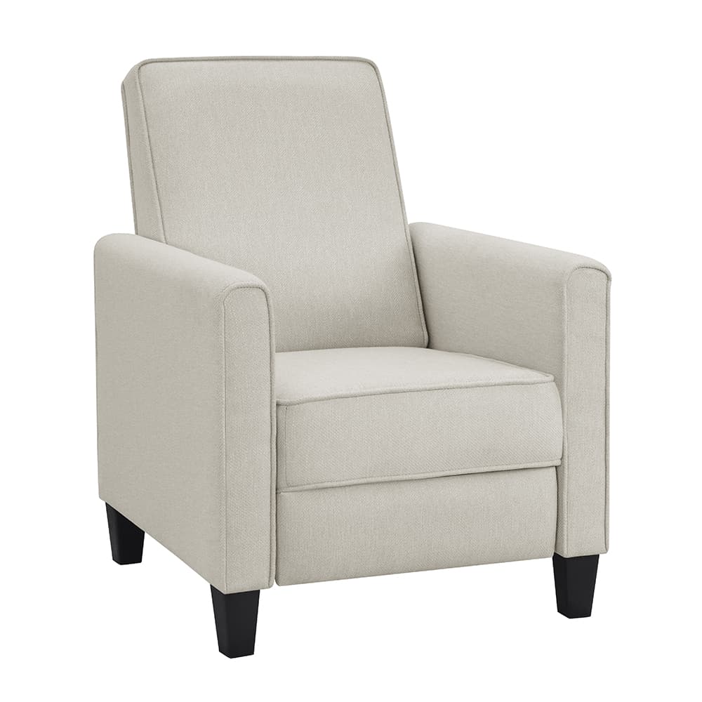 Enjoy a book or engaging conversation in this transitional push-back chair. Beige linen fabric offers a sophisticated appearance, while the cushions provide comfort and support for any sitting area or living room. The chair features a straight, squared back with rounded track arms and a slender shape. Tapered feet are a perfect finishing touch, complementing its clean profile. Recliner Type: Manual. Reclining Method: Push Back. Weight Capacity: 250 lbs.