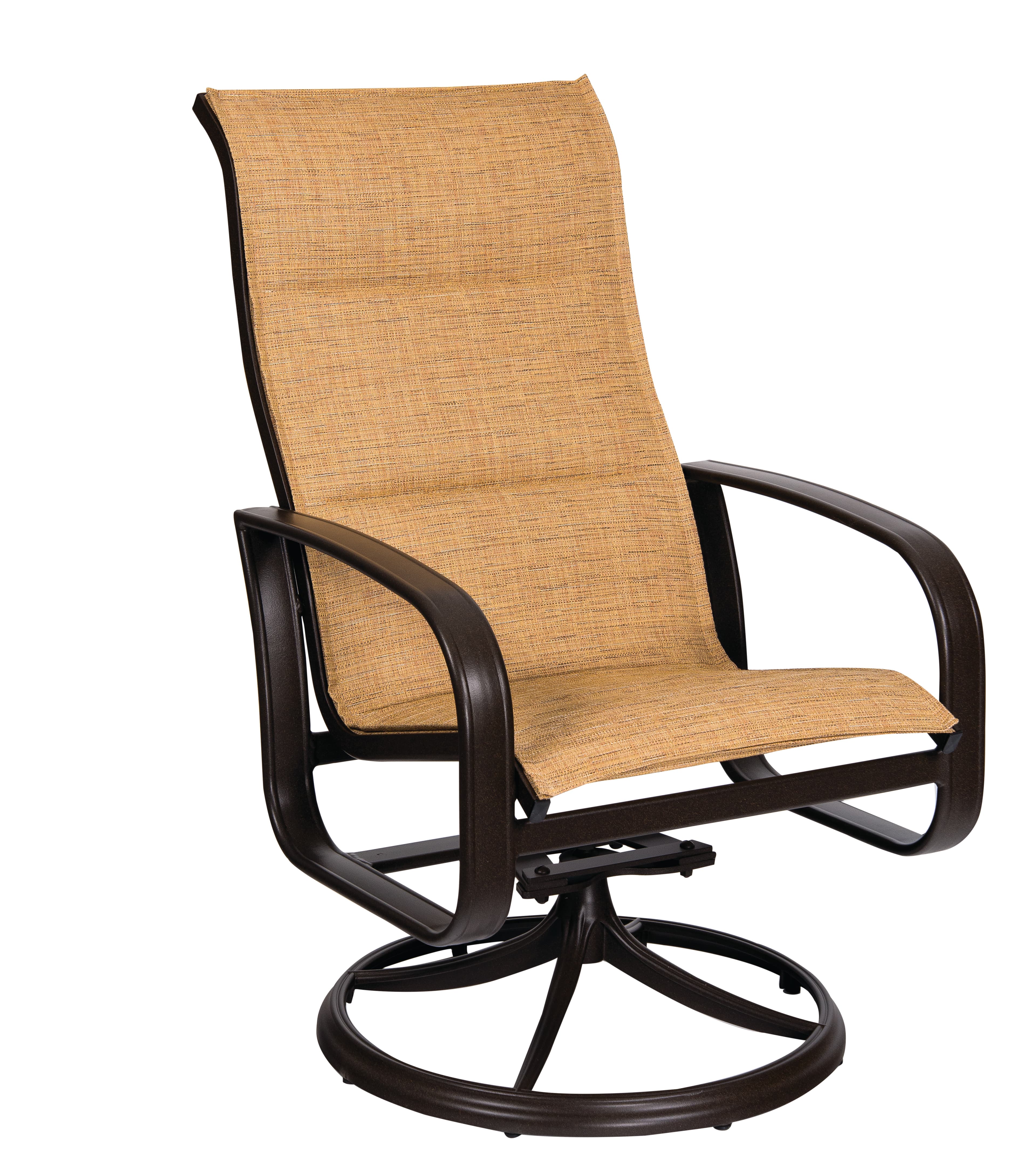 Crafted from aluminum, the Cayman Isle chair offers a padded sling design for comfort in dining settings. Designed with a high back, it features a swivel and rocking mechanism for added relaxation.