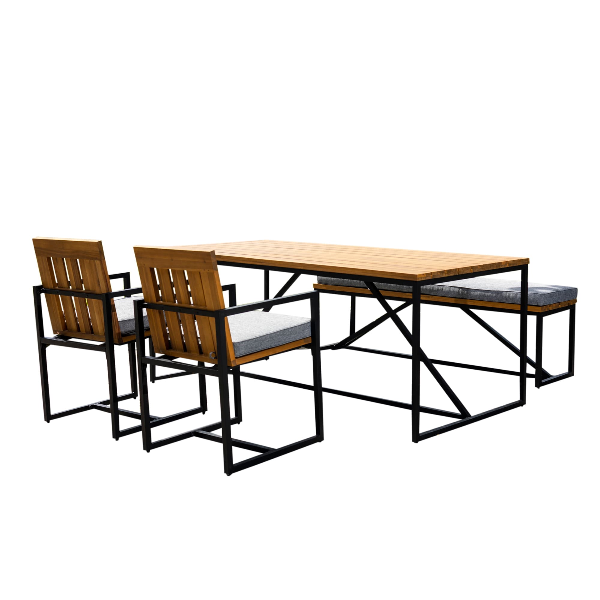 Enhance your patio or deck with the Lakewood 4-Piece Outdoor Dining Set from Panama Jack Outdoor. Featuring two dining chairs and a bench, each piece is crafted with sturdy extruded aluminum frames adorned with honey Acacia wood accents. Draped in light grey outdoor fabric, you have the option to choose from our wide selection of Sunbrella cushions for a personalized touch. This set offers a perfect combination of elegance and practicality for your outdoor dining area.