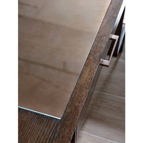 Crafted from hardwood, this writing desk blends style with functionality, featuring white oak veneers, a steel framework, and seven sliding drawers. The mocha stain and silver-leaf panel beneath clear glass complete the sleek and modern design.