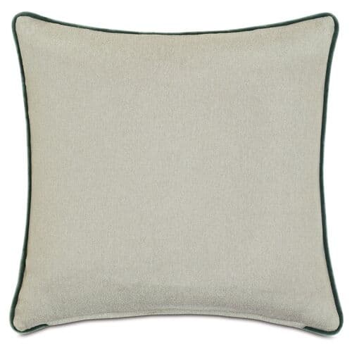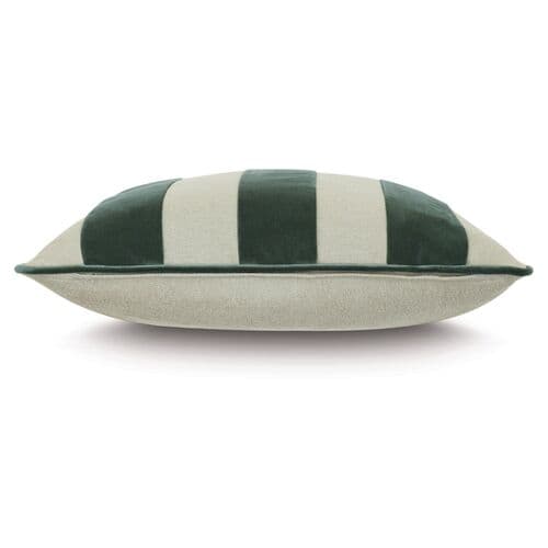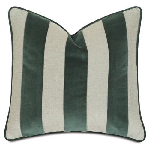 Green velvet stripes add plush texture and rich color to the front of this khaki pillow. The back features solid khaki with green edging, offering two design options. Feather fill provides luxurious loft, and a zipper closure ensures convenience.