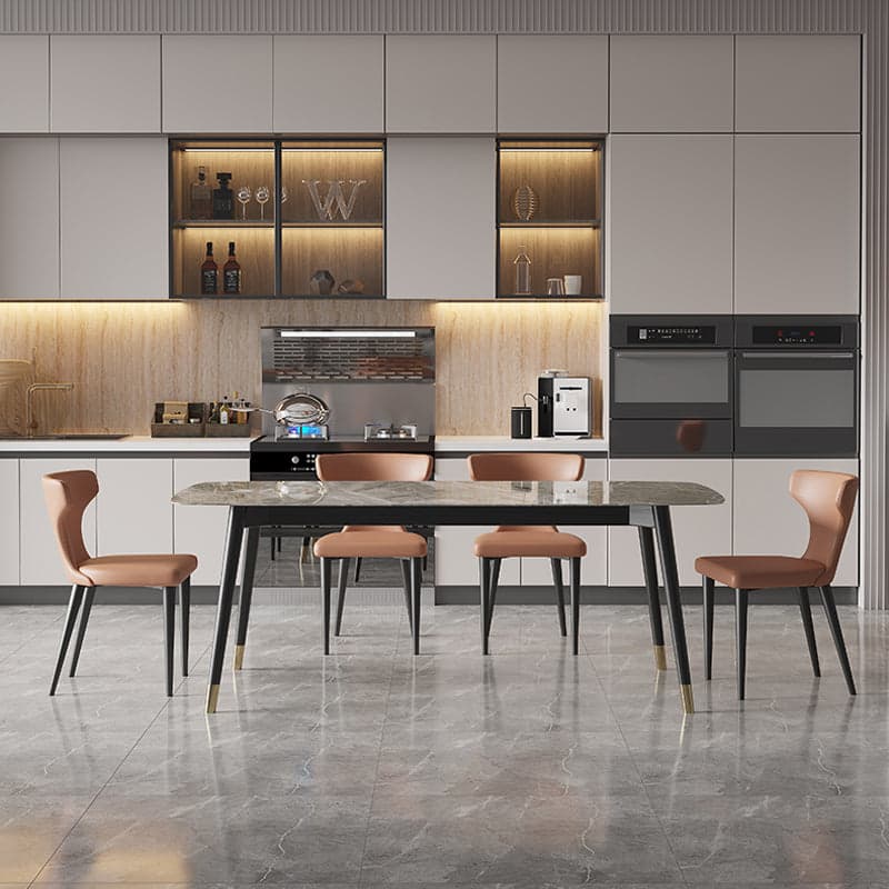 The sintered-stone top has a glossy finish supported by a delicate staggered line texture, offering a table that is both earthy and modern. With diamond-grade hardness, it resists scratches, and its high-temperature resistance ensures long-lasting durability. Rounded corners add elegance and safety. The intricate sintering process gives each tabletop unique natural stone patterns, created randomly during high-heat molding, presenting a unique aesthetic with subtle variations.