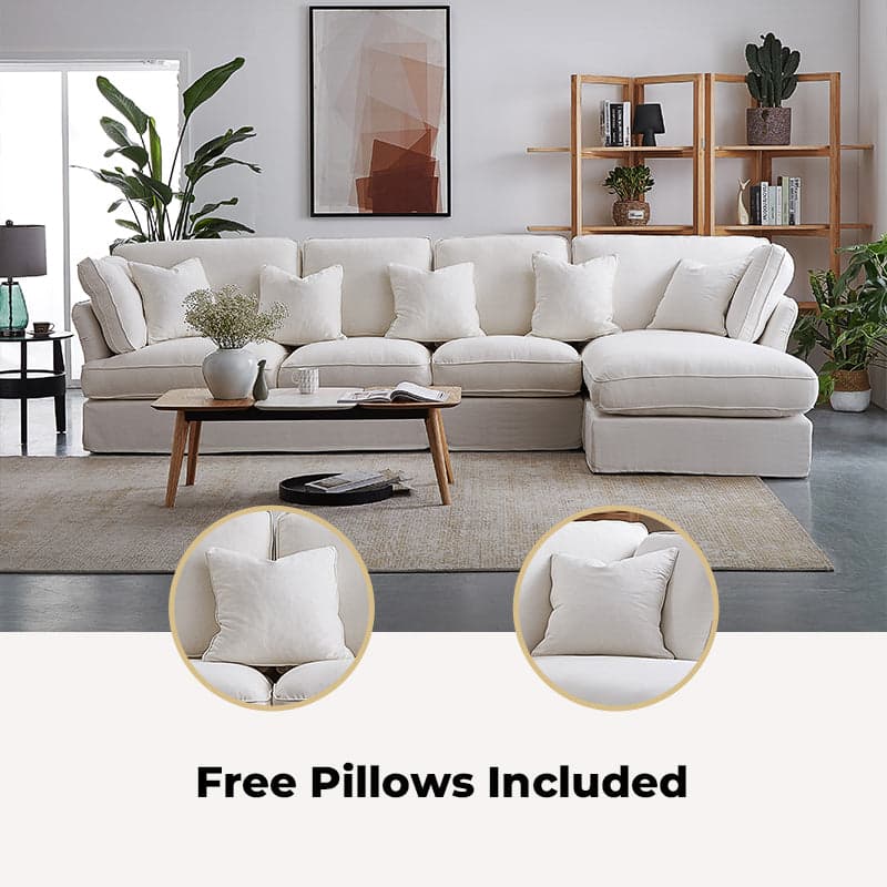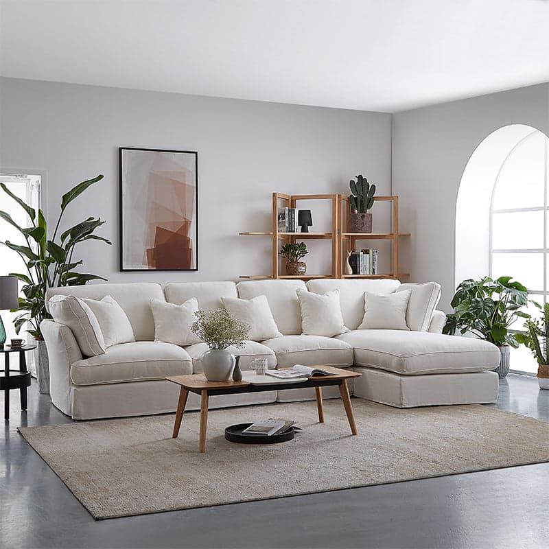The Hygge Sectional Lounger provides a cozy and relaxed atmosphere with its soft padding and durable textile. After a tiring day, its inviting roundness offers gentle support, easing weariness. Made with abundant soft down and HD foam, it promises the comfort you seek. The chosen linen is gentle on the skin and compatible with jeans, preventing stain buildup. It's an ideal retreat for maintaining a calm aesthetic.