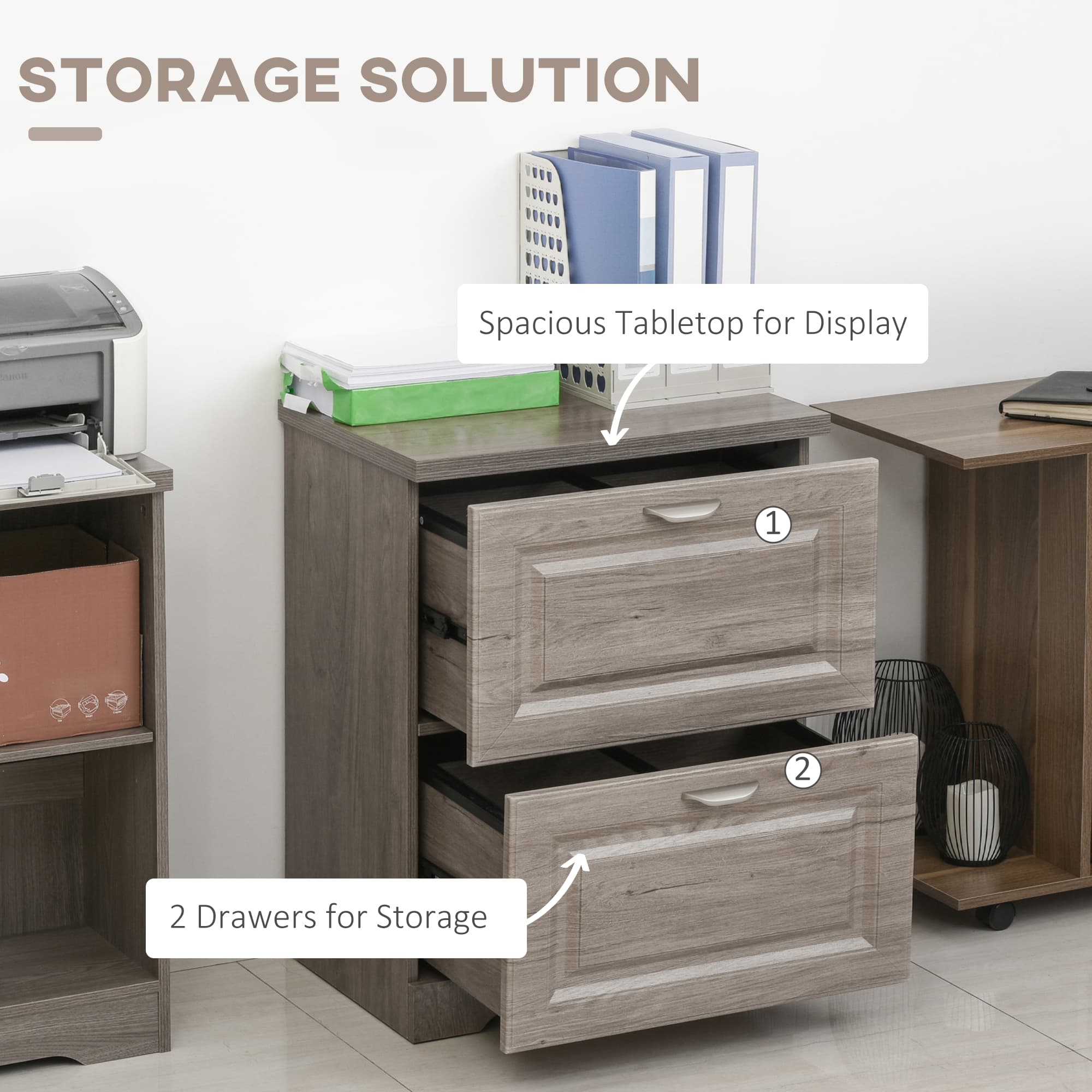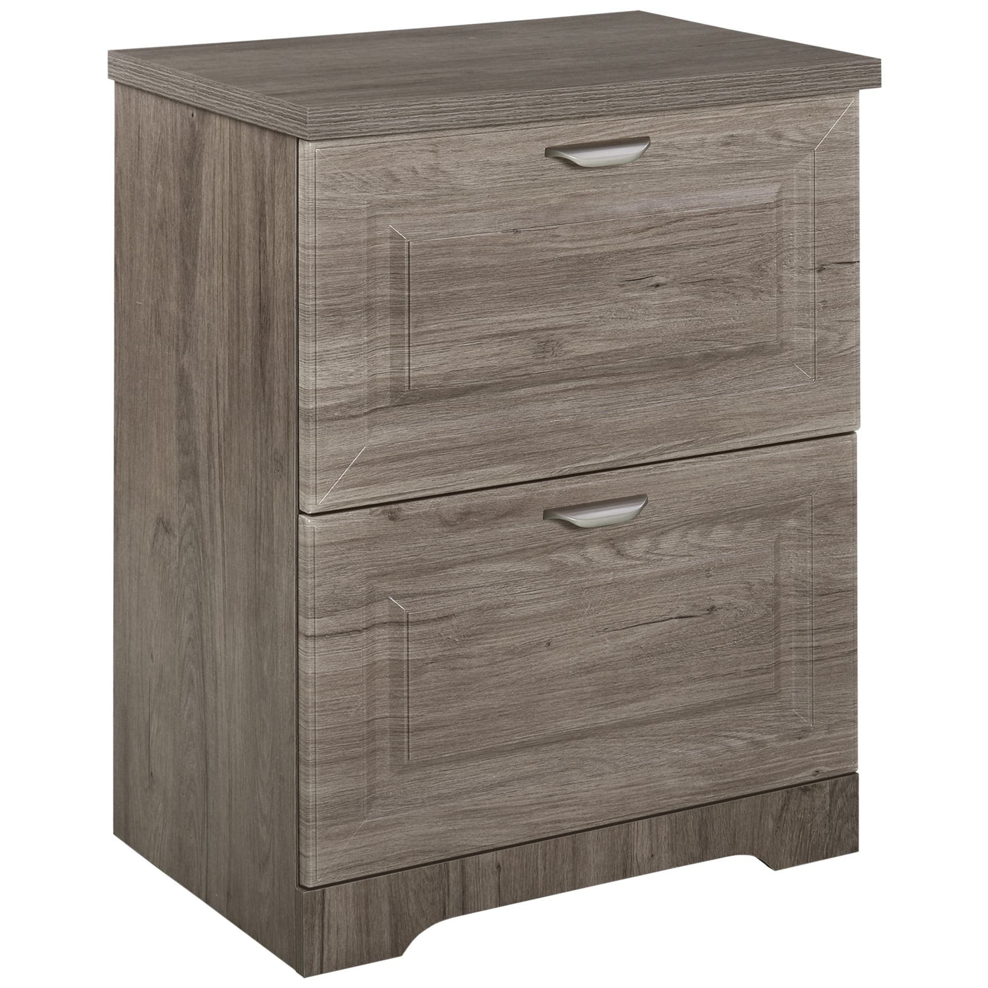 Organize your home office promptly with the HOMCOM wood filing cabinet. It features wood grain and elegant hardware accents for a modern look. The 2 easy-glide drawers store hanging letters and legal-sized files. Its spacious top increases storage space. Made from solid P2 MDF and particleboard, this filing cabinet is a stylish and stable addition to any home office or study. Access important files easily with our 2 drawer cabinet.