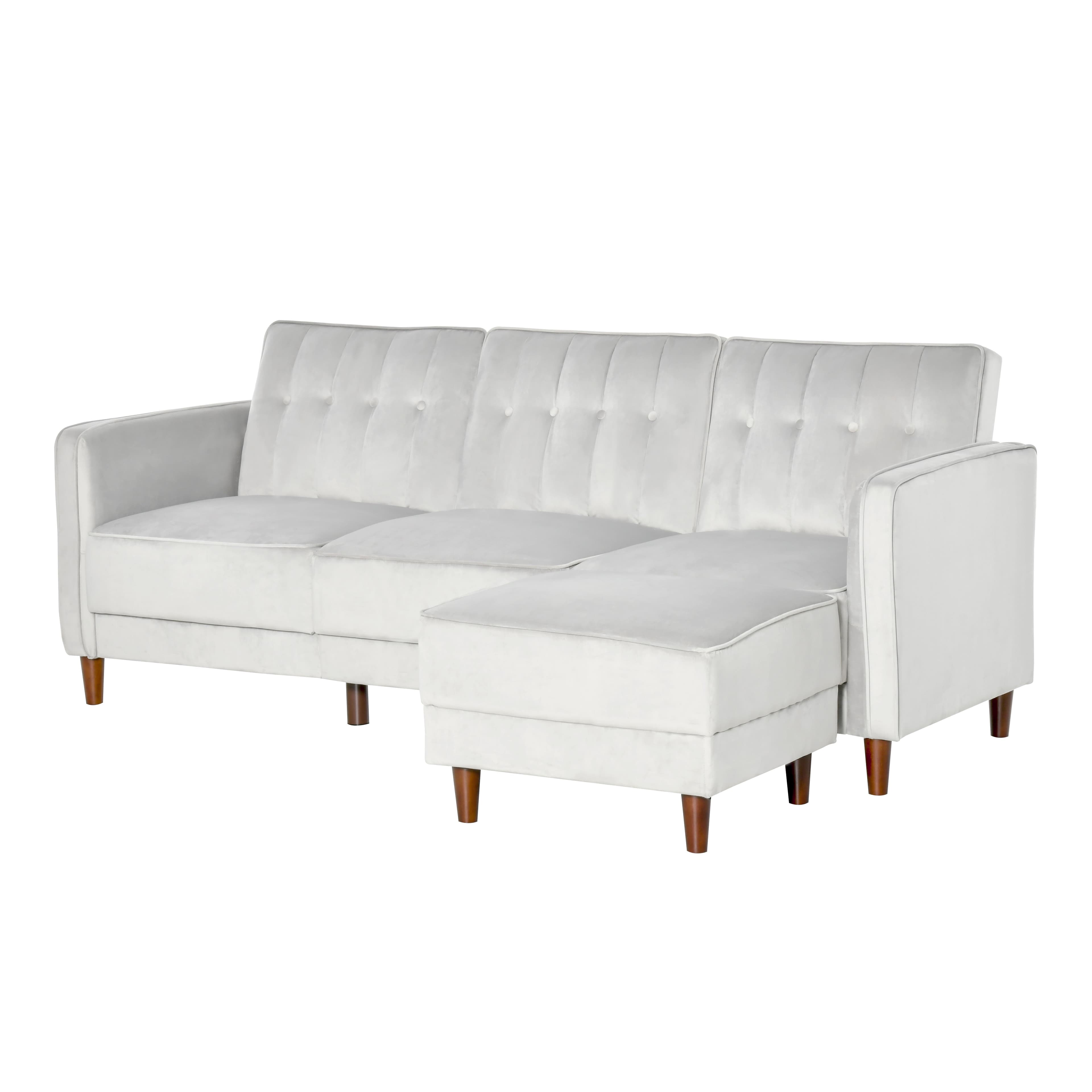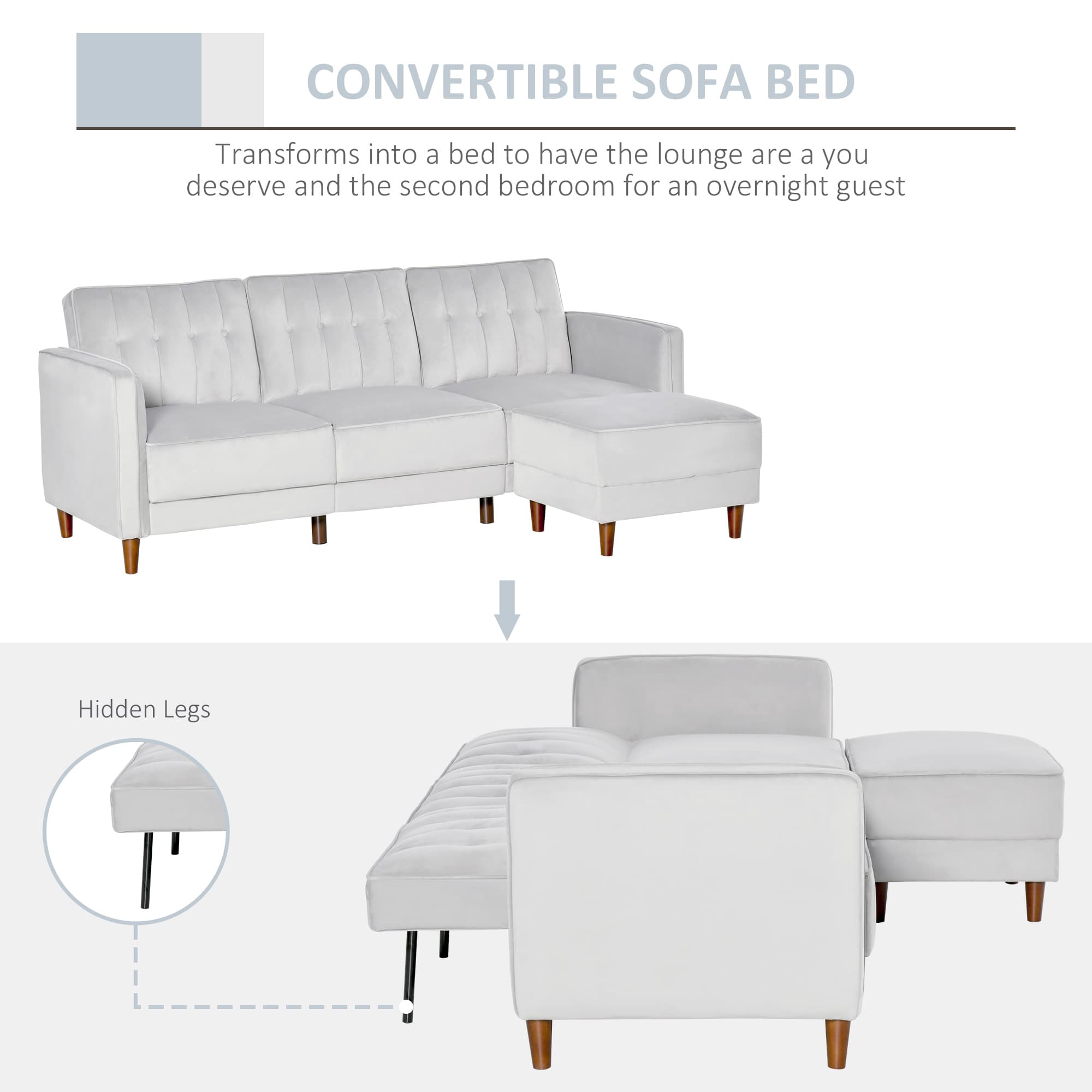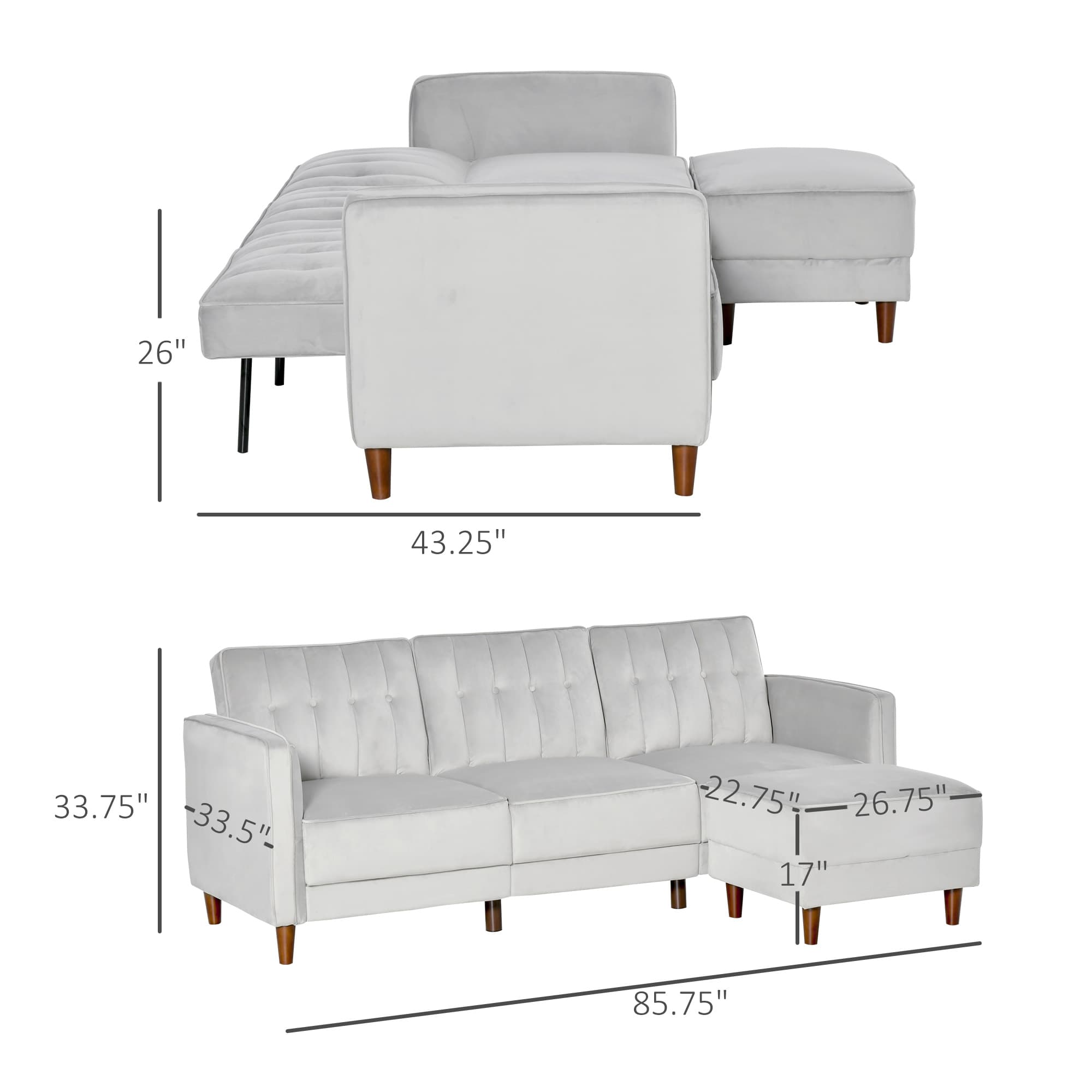 HOMCOM Upholstered Sofa bed Reversible Sectional Sofa Set Velvet-Touch Sleeper Futon with Footstool, Light Grey