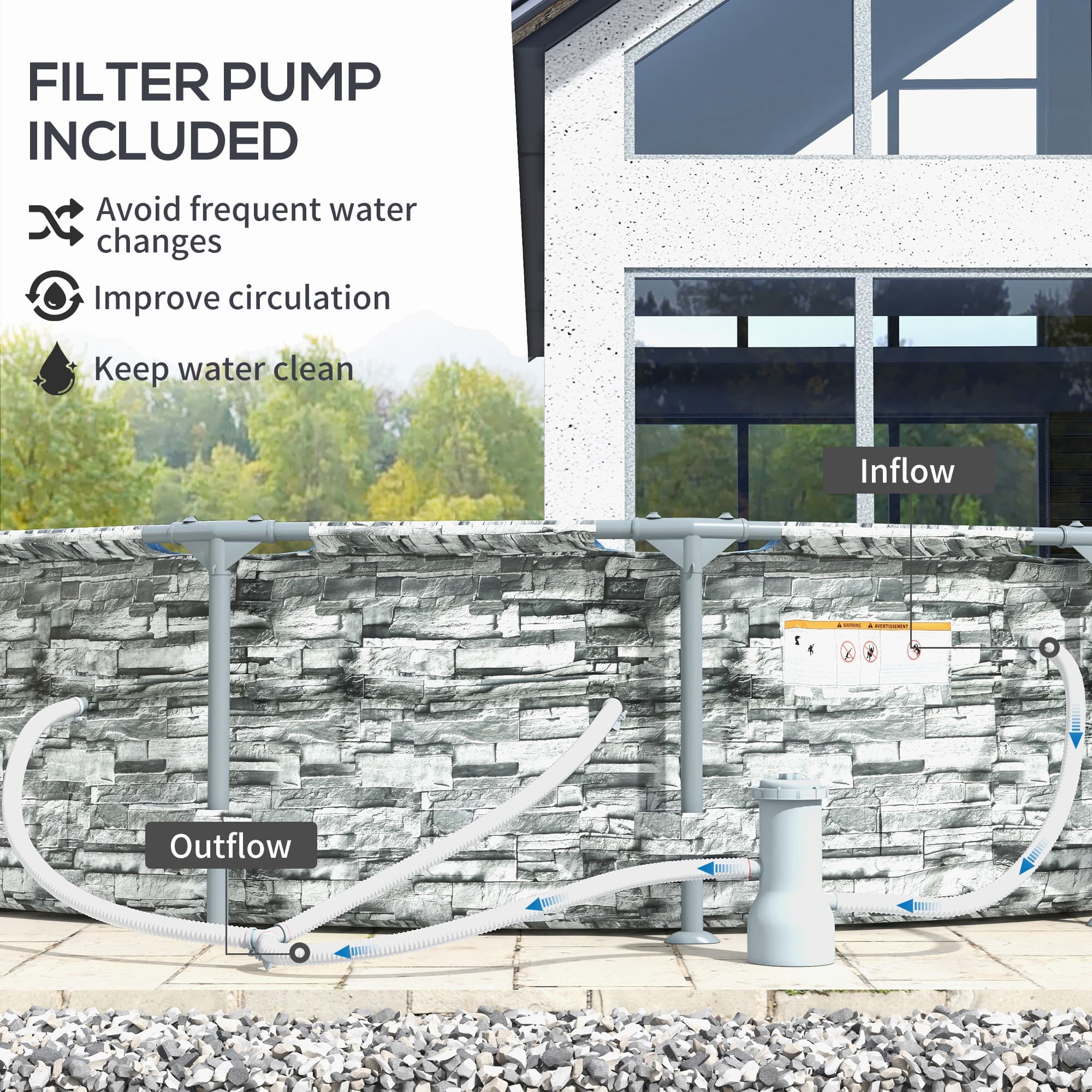 Enjoy summer fun with the Outsunny Above Ground Swimming Pool, measuring 14 feet and accommodating up to 8 adults. The blue tile-print interior creates an inviting space to splash around. Its sturdy steel frame promises years of use, while the filter pump ensures clear water. Look through the windows as you relax in your backyard oasis.