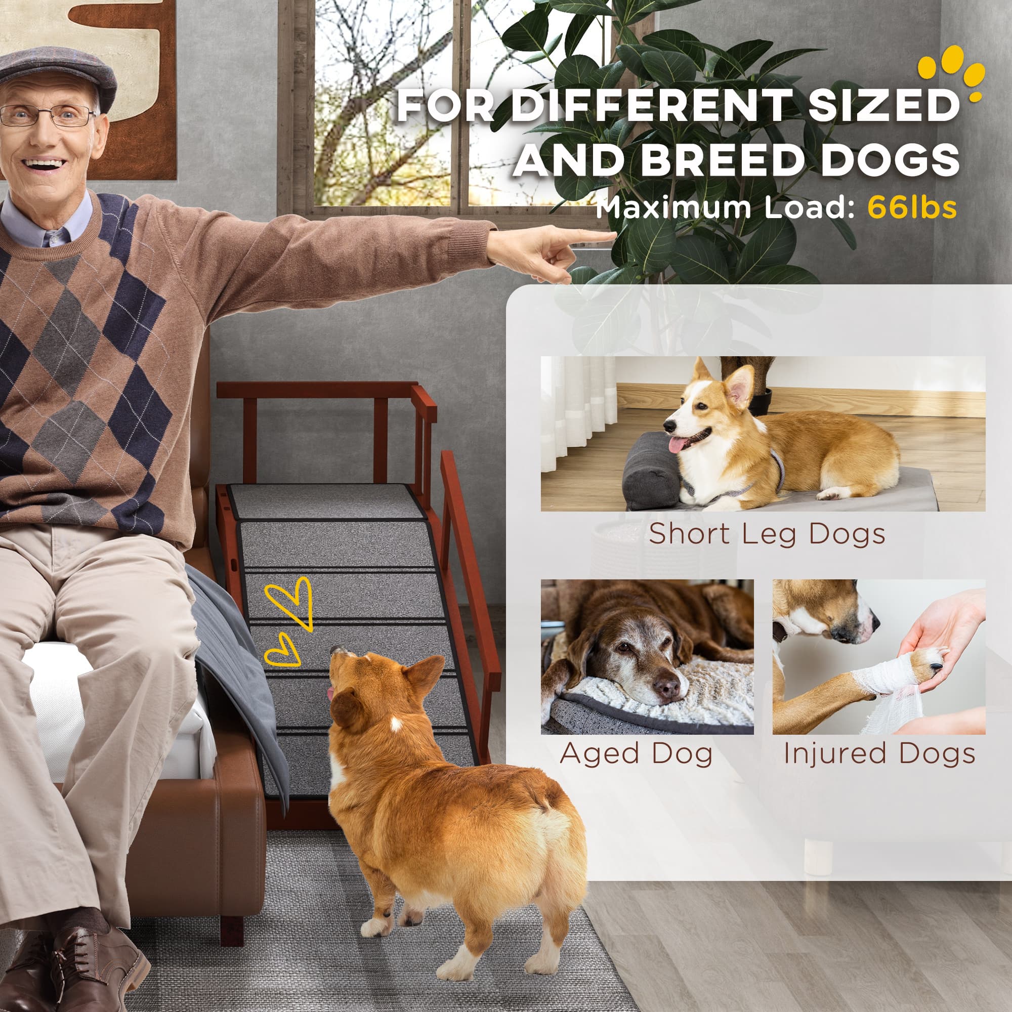 Let your furry friend climb with ease using the PawHut Dog Ramp! Featuring 3 removable guardrails for added safety and a gentle 20° slope with 4 stripes, this cat ramp ensures smooth and secure access to beds, sofas, and more. Crafted from pine wood and equipped with non-slip carpet surface, this dog ramp for couch is great for dogs under 66 lbs., especially older pets. Make every climb a joy!