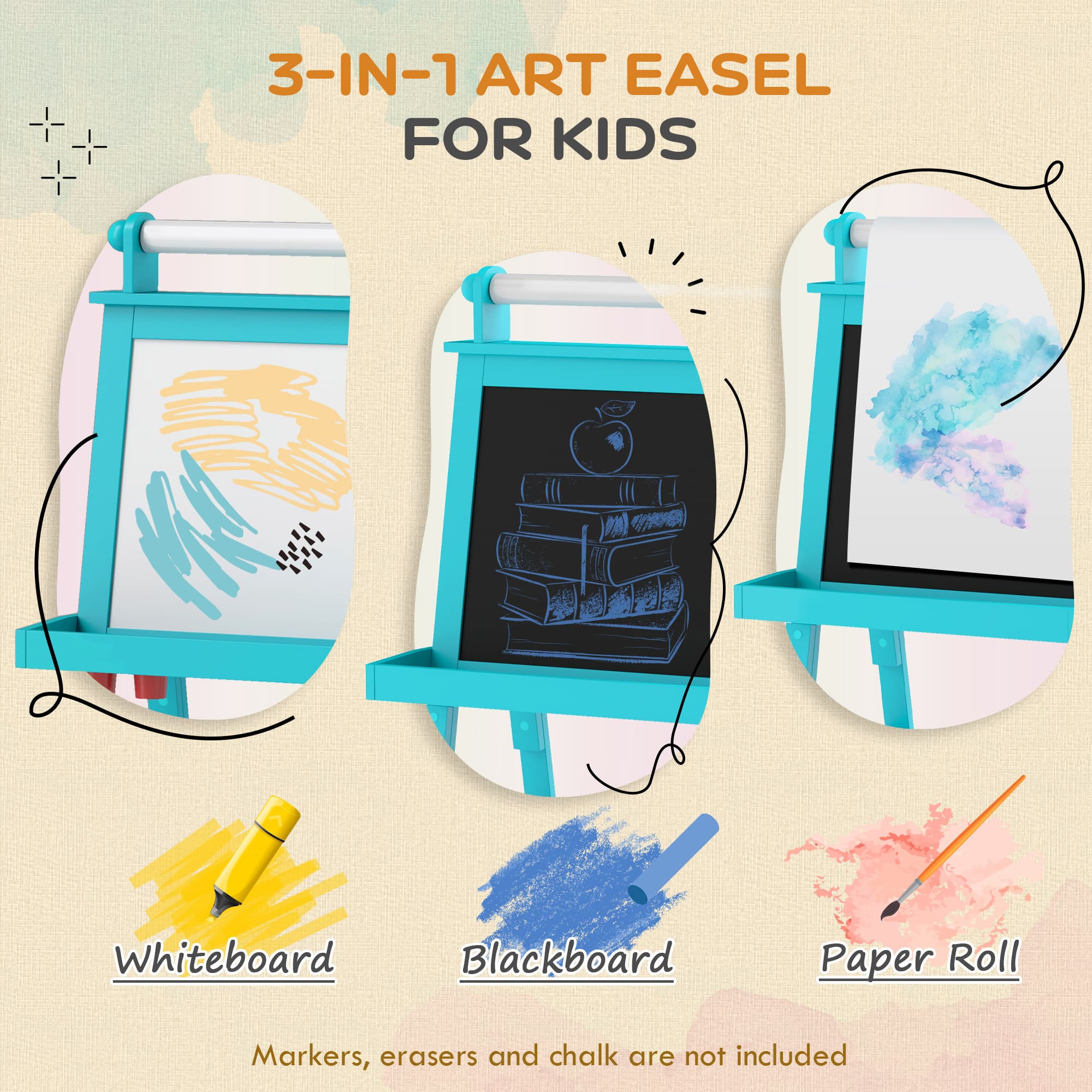 Qaba Double Sided Easel for Kids, Standing Toddler Easel with Paper Roll, Magnetic Whiteboard, Chalkboard & Storage, Blue